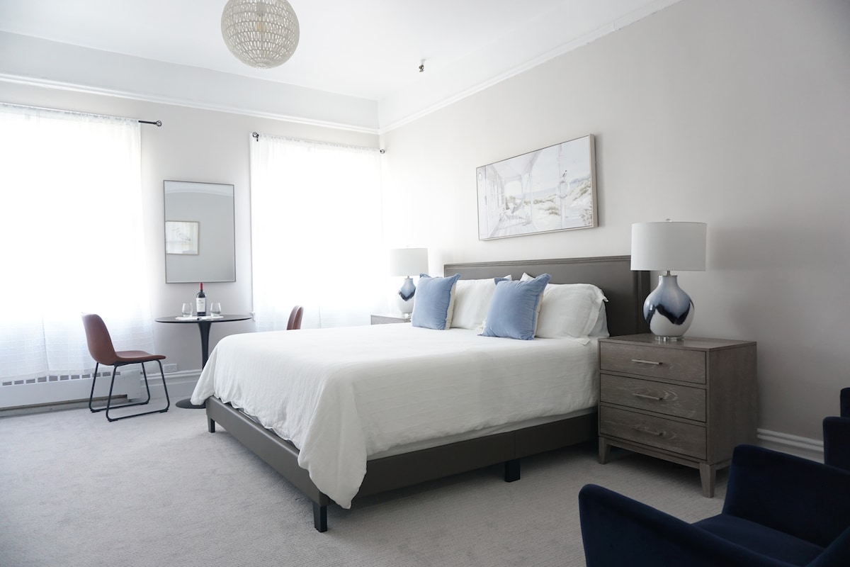 Private Room. Rooms feature one queen bed with a pillow top mattress, super-fast WiFi, Chromecast, 49” high-definition television with HDMI and USB Ports, USB Outlets and a mini-refrigerator. Hotel amenities include reusable water bottle and FloWater filling stations in the lobby. Standard Rooms are interior facing and have a view of our courtyard. Newly Redesigned with a modern color palette of stark whites, subtle grays, and bold blues accented by rustic wood features.