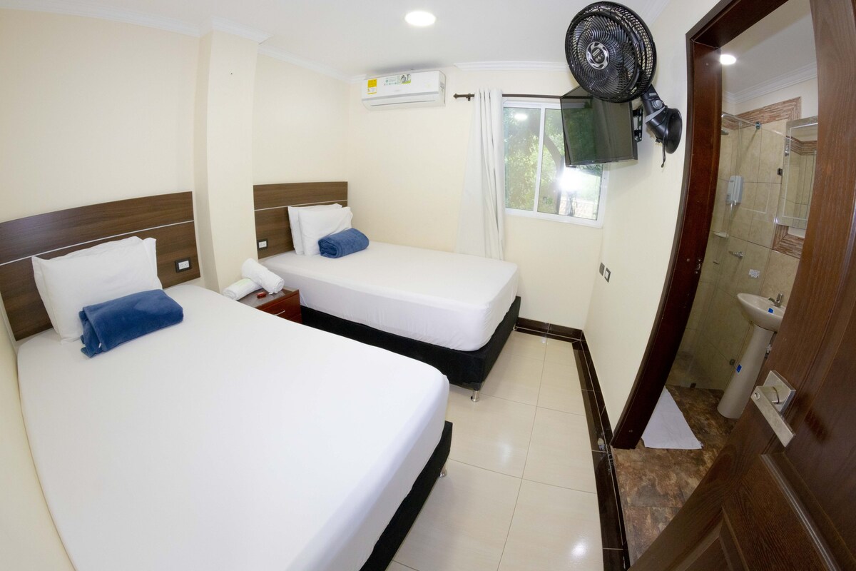 This room has a double bed and a single bed, TV, amenities, air conditioning, fan and private bathroom.