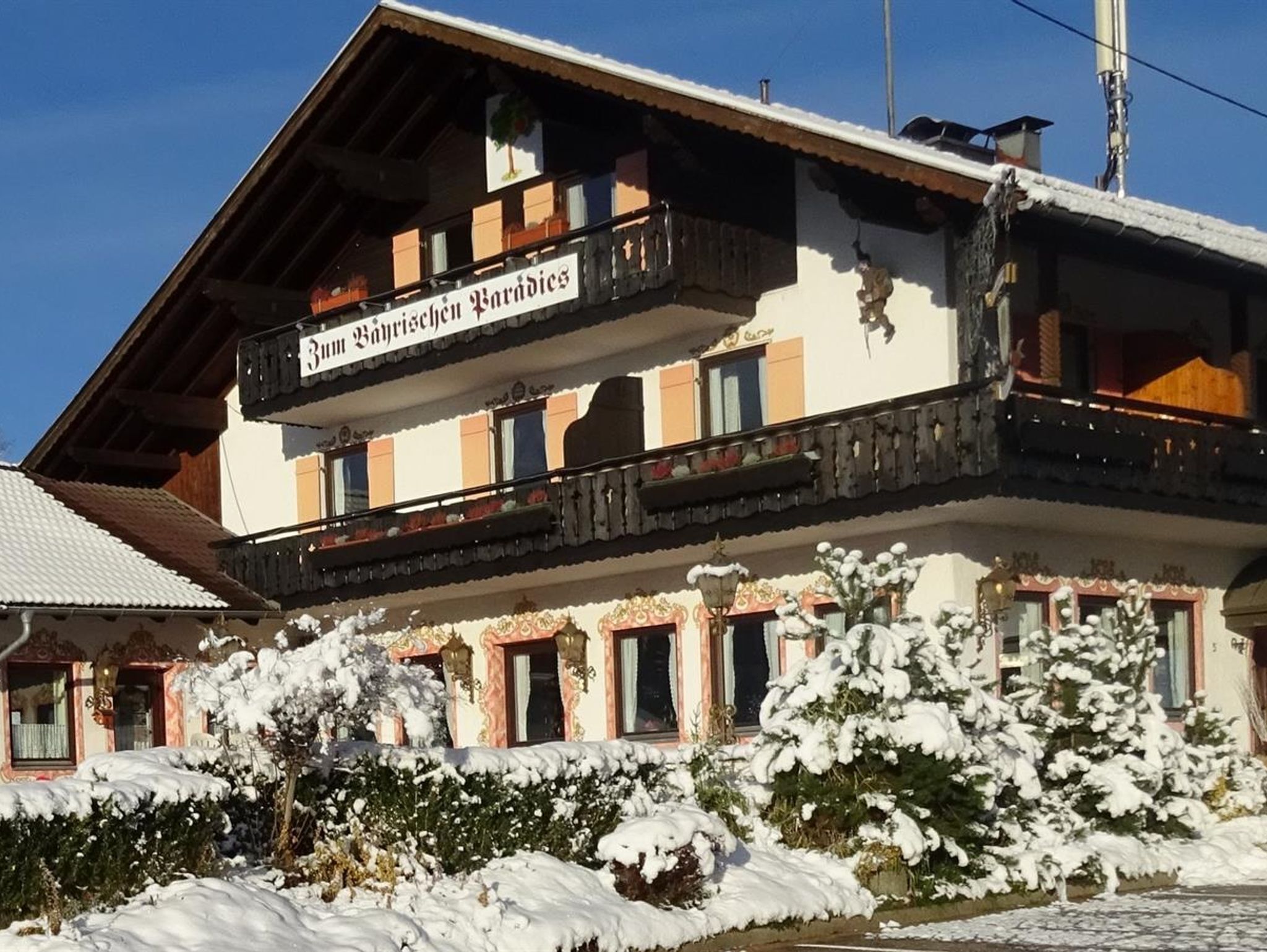- A well maintained house with a cozy and friendly atmosphere. - With us you do not need anything to do without: delicious food according to urbayerischer and alps cuisine, vegetarian and vegan dishes, gluten-free food, Ammergauer-Alpen-breakfast from 6.00 o'clock - large lawn, barefoot path, sun terrace, Sun loungers, playground, in-house herb garden, petting animals (rabbits and guinea pigs), restaurant and function room- in a scenic location with views of the Ammergau Alps - sights such. The royal castles or the Wieskirche are easily accessible by car or public transport. Many hiking, biking trails, Nordic walking trails and trails directly from the house. - Free spacious parking, also for coaches. - Garages are available on request for a fee,����������������������� - - - Free and secure parking spaces for bicycles.- Meditation place and spaces on the pilgrimage path Ammergauer Alpen- Motorcycle friendly operation - Sauna, steam bath and power plate available for a fee- Auszeit to prevent burnout-endangered persons