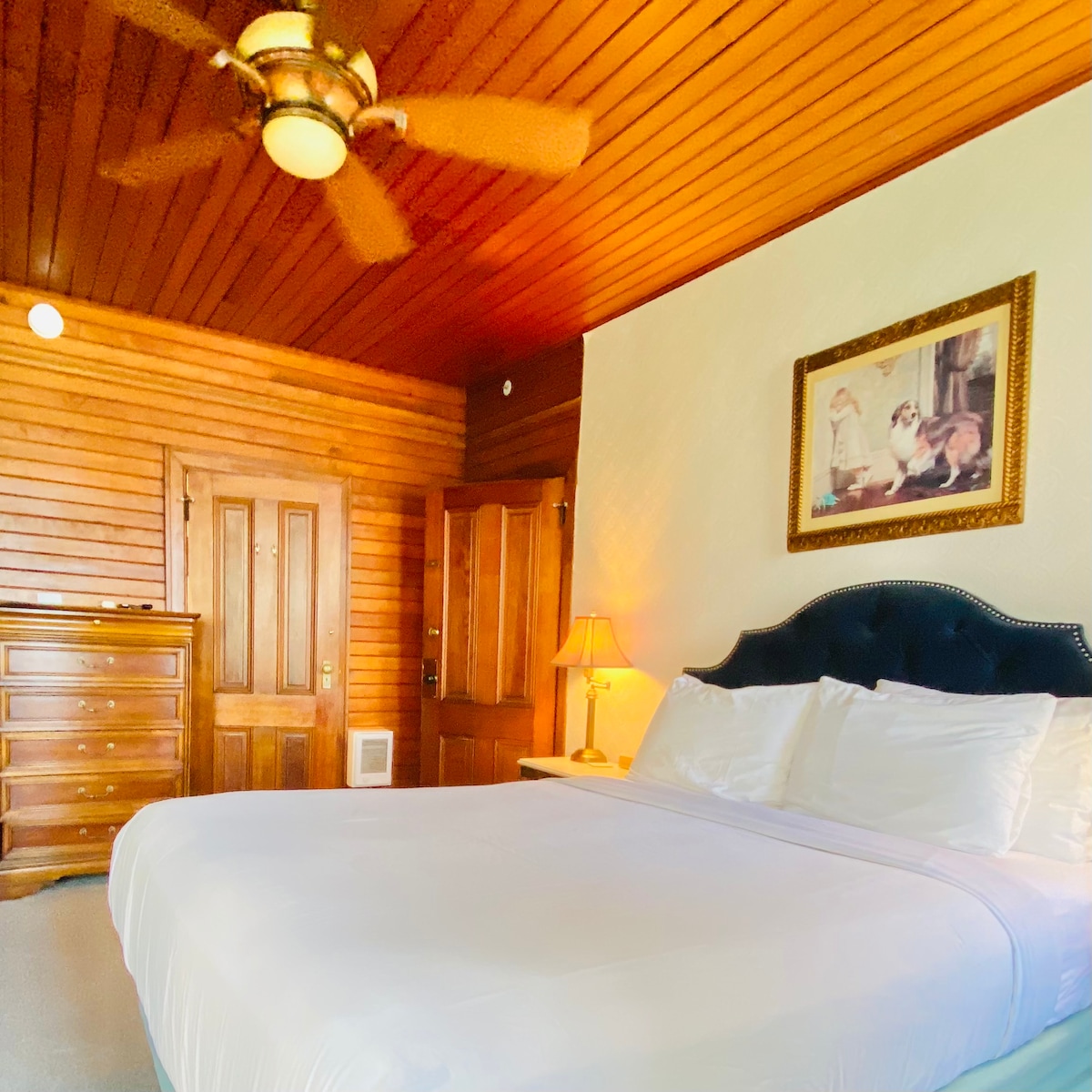 Emma's Room: Located on the second floor of the Historic Wing. The natural fir ceiling and walls frame this room. The cherry wood Queen four-poster bed completes the cozy space. The room has a ceiling fan and full large bathroom with shower and tub combination. 1 block from beach.