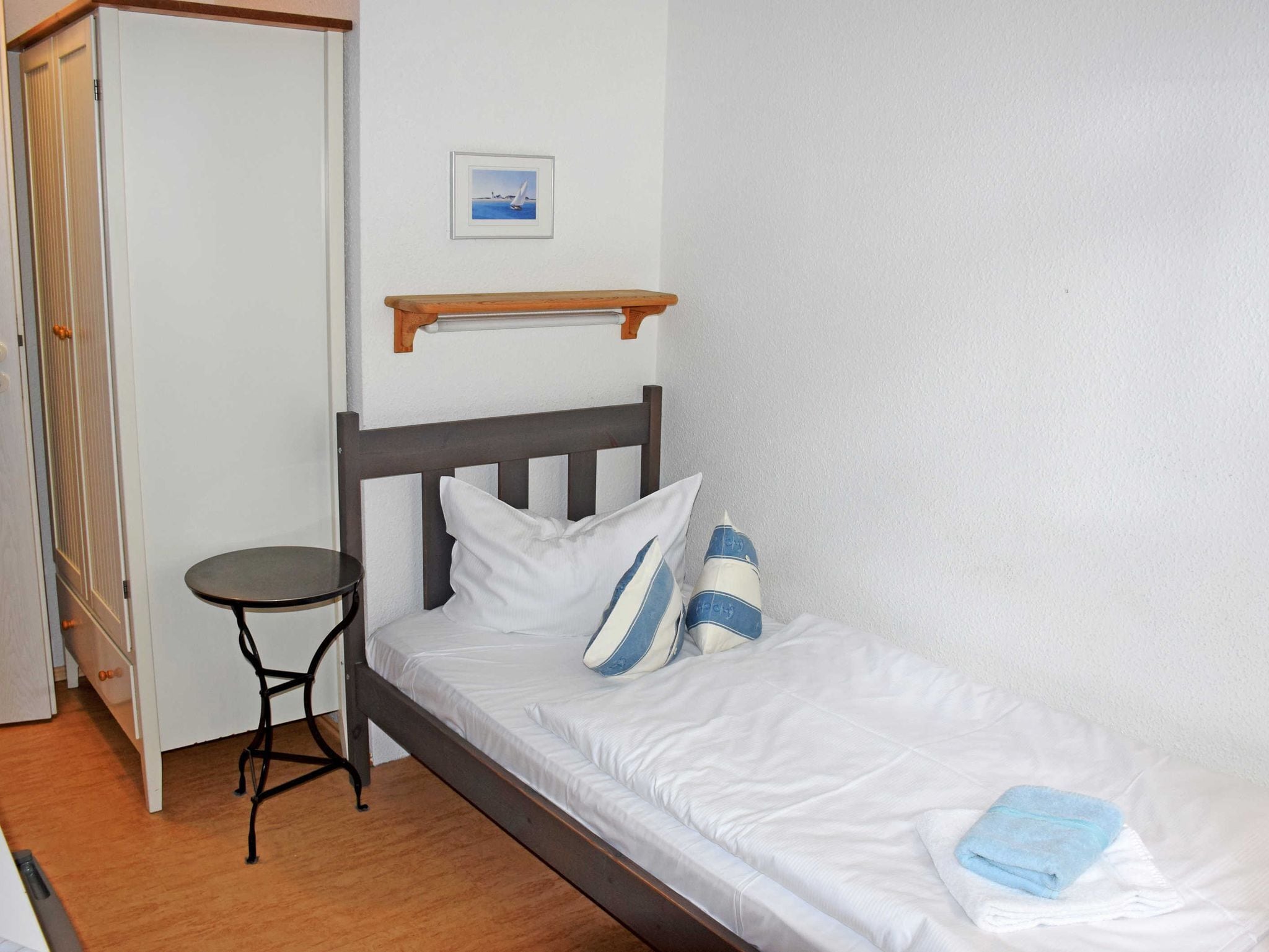 Our single rooms can accommodate a guest and a child up to 3 years in travel cot. The room has a single bed with a bedside table and reading lamp, a wardrobe, a chair with a table and a flat-screen TV. The bathroom has a shower, vanity, towel warmer, hairdryer, vanity mirror & toilet and has natural light. The rooms are not cleaned daily, but only after departure! On arrival, fresh towels are ready and the beds are already made with linen. A travel cot can be provided if required. Please specify this when booking. Internet Wi-Fi is available.