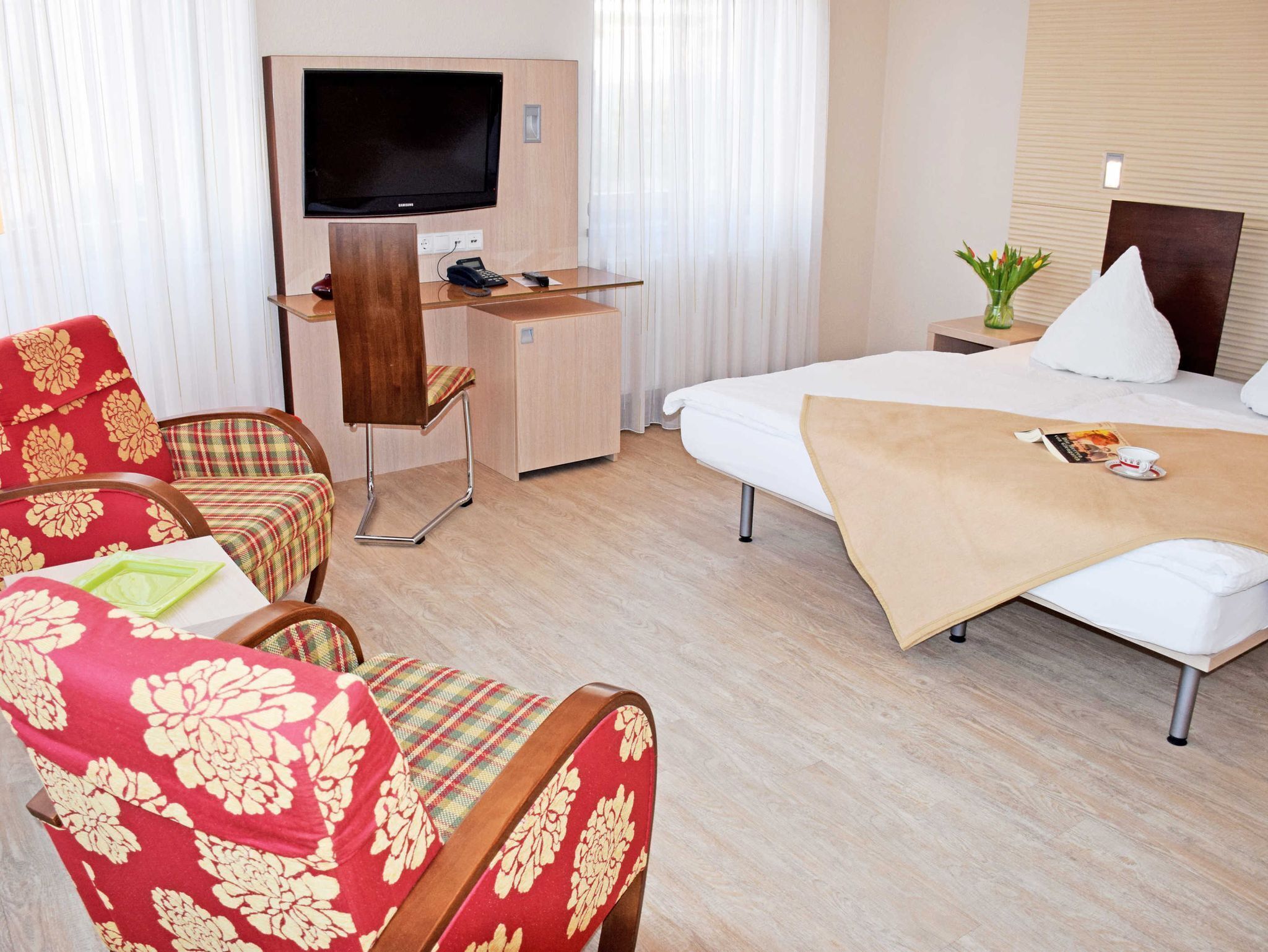 Our double rooms with balcony can accommodate 2 guests and one child up to 3 years in travel cot. The room has a double bed with bedside tables and reading lamps, a wardrobe, a sofa set and a flat-screen TV. The bathroom has a shower, vanity, towel warmer, hair dryer, vanity mirror and toilet. On the balcony chairs are available.