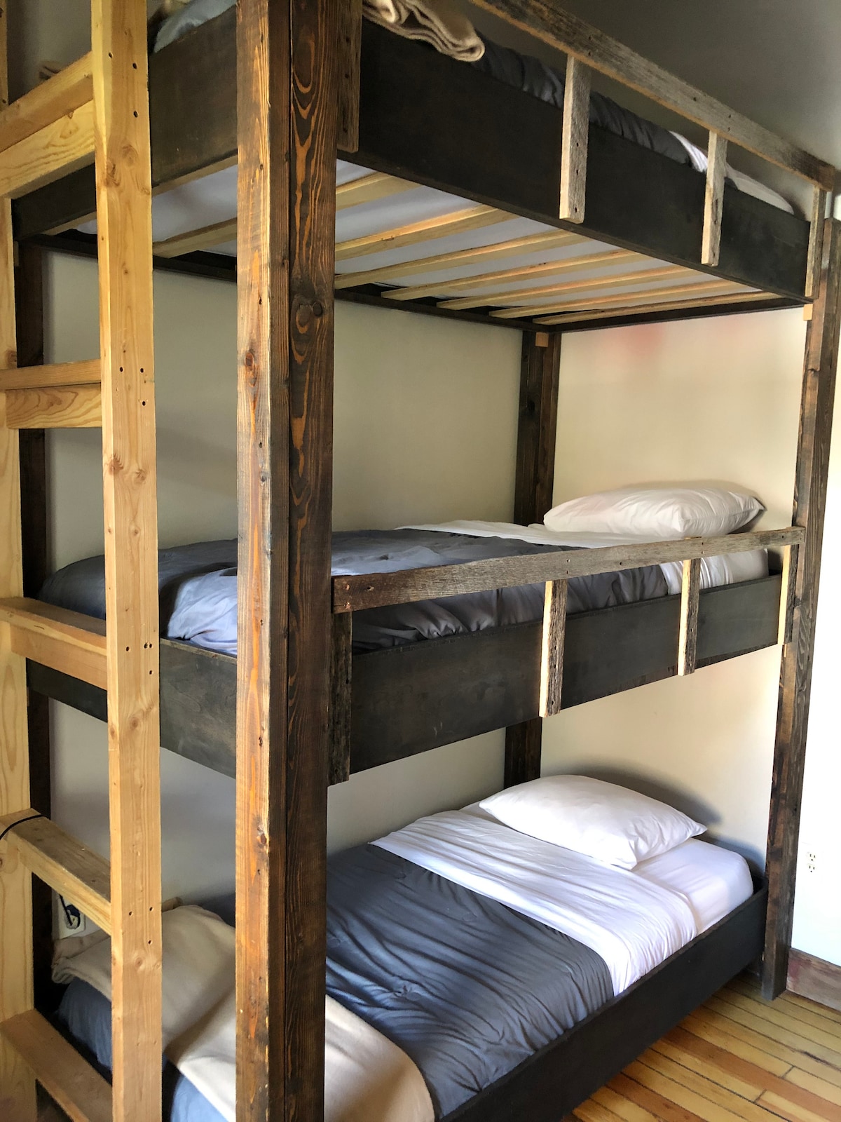 Private room with two Full beds. One of the full beds is up in a loft. Shared dorm bathrooms. Record player. Dogs encouraged. Great for a group of 2-4. Fantastic value.