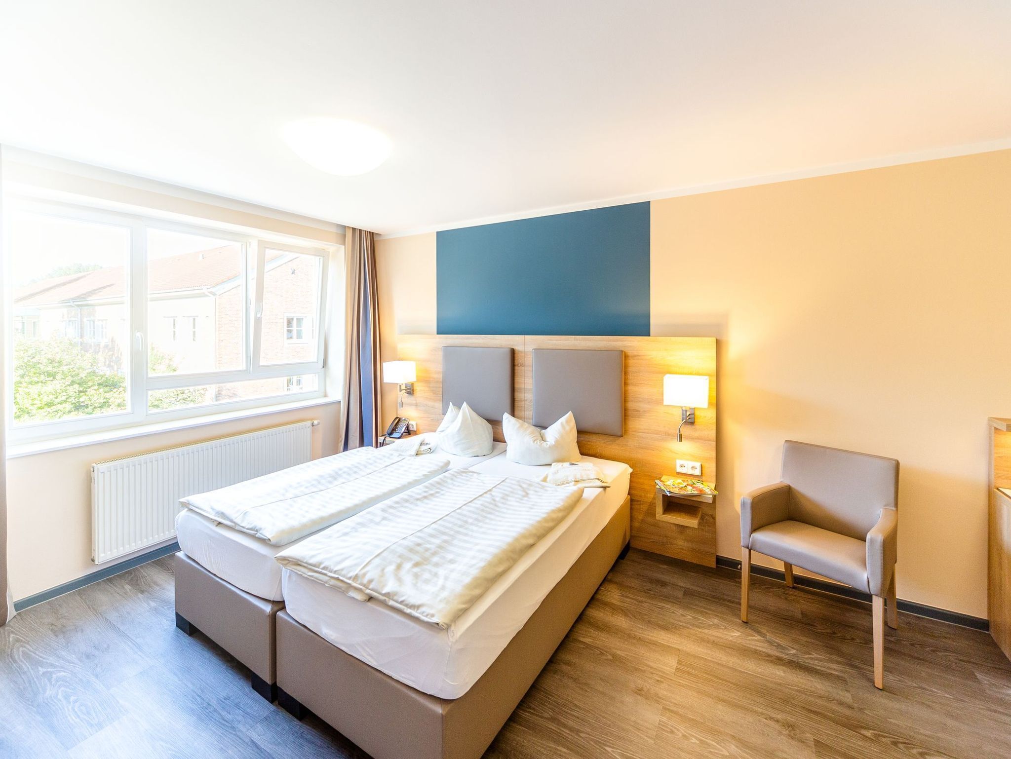 Our attractive standard double room, with its elegant color scheme, promises harmony and hospitality. Double beds, on request separated from each other. Shower / WC / hairdryer, free Wi-Fi, desk, direct dial telephone, cable TV / radio, flat screen TV, soundproof windows. The standard double room villa is located in the holiday home Villa am Jungfernstieg, a side building of the hotel. Parking is optional on the in-house yard. The reception is in our main building - Hotel am Jungfernstieg - which is about 150 meters from the villa. From 7 am to 10 pm you will receive your room key as well as further information for your stay in Stralsund.
