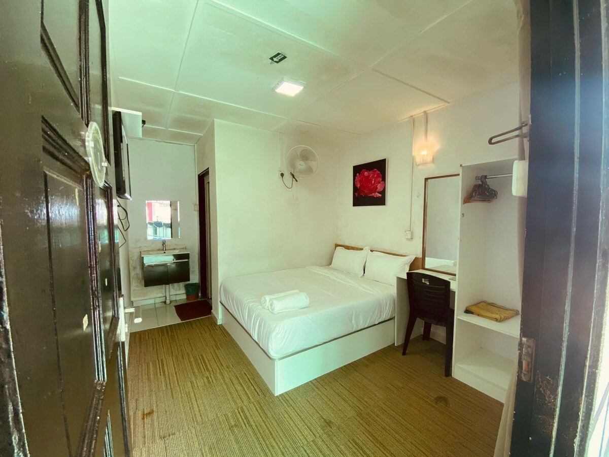 The room has a Queen Size bed, wardrobe with hangers, bedside table, ceiling fan and free Wifi.