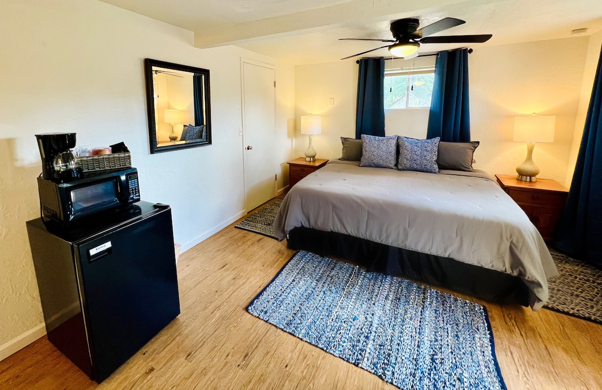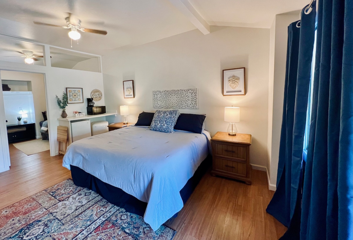 You won’t want to leave this charming, one-of-a-kind place at the historic EL RANCHO ROBLES! This newly refurbished 1BR/1BA offers a comfy King size bed, bathroom with a shower/tub combo, living room, FULL kitchen w/small dining area, 2 ceiling fans, A/C, heat, large patio, posh linens & toiletries. Everything you’ll need for a nice, relaxing stay.