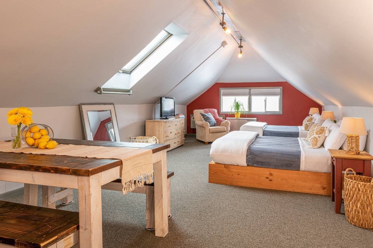 The Skylight Studio unit features a large skylight. It is great for stargazing or watching the gentle snow fall that comes before a day of heavy skiing. An updated kitchenette, and ample sleeping accommodations are also included. Note: unit is second level, only accessible by stairs.