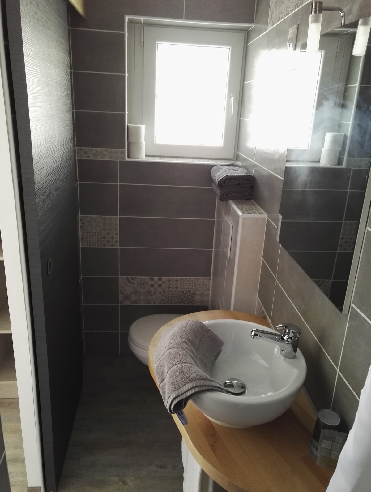 The accommodation is located on the ground floor and on the ground floor. It comes with a shower, toilet, and fridge. The floor is tiled or on vinyl (no carpeting). In front of your room you will have a table with chairs