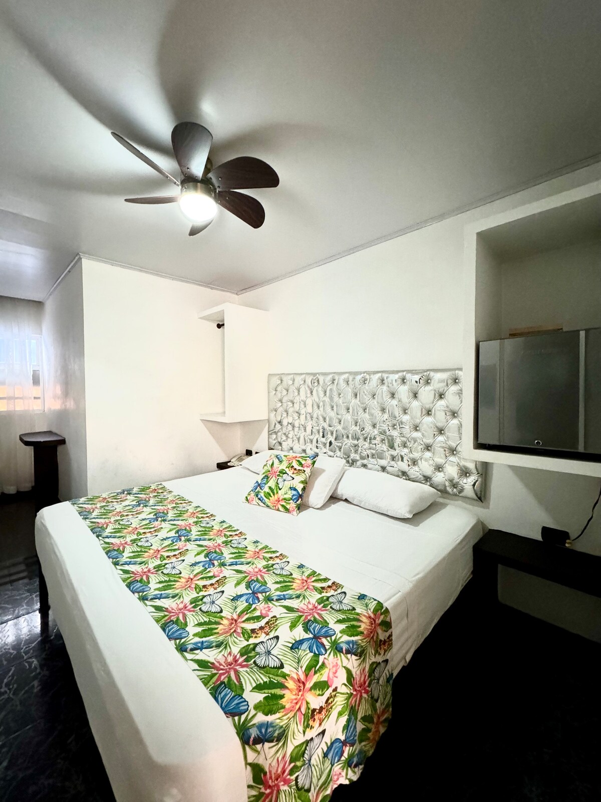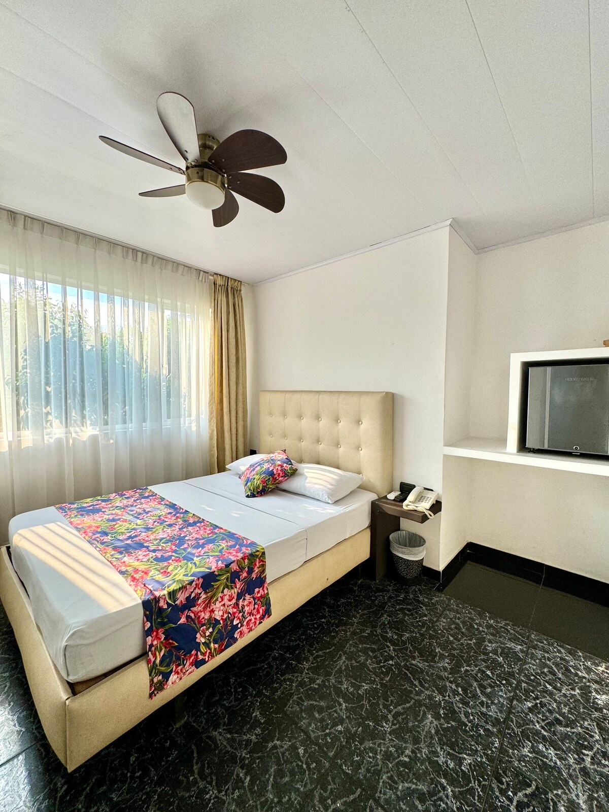 Room 206 imperial, has a king bed, private bathroom, fan, mini bar.