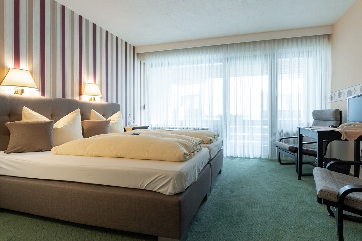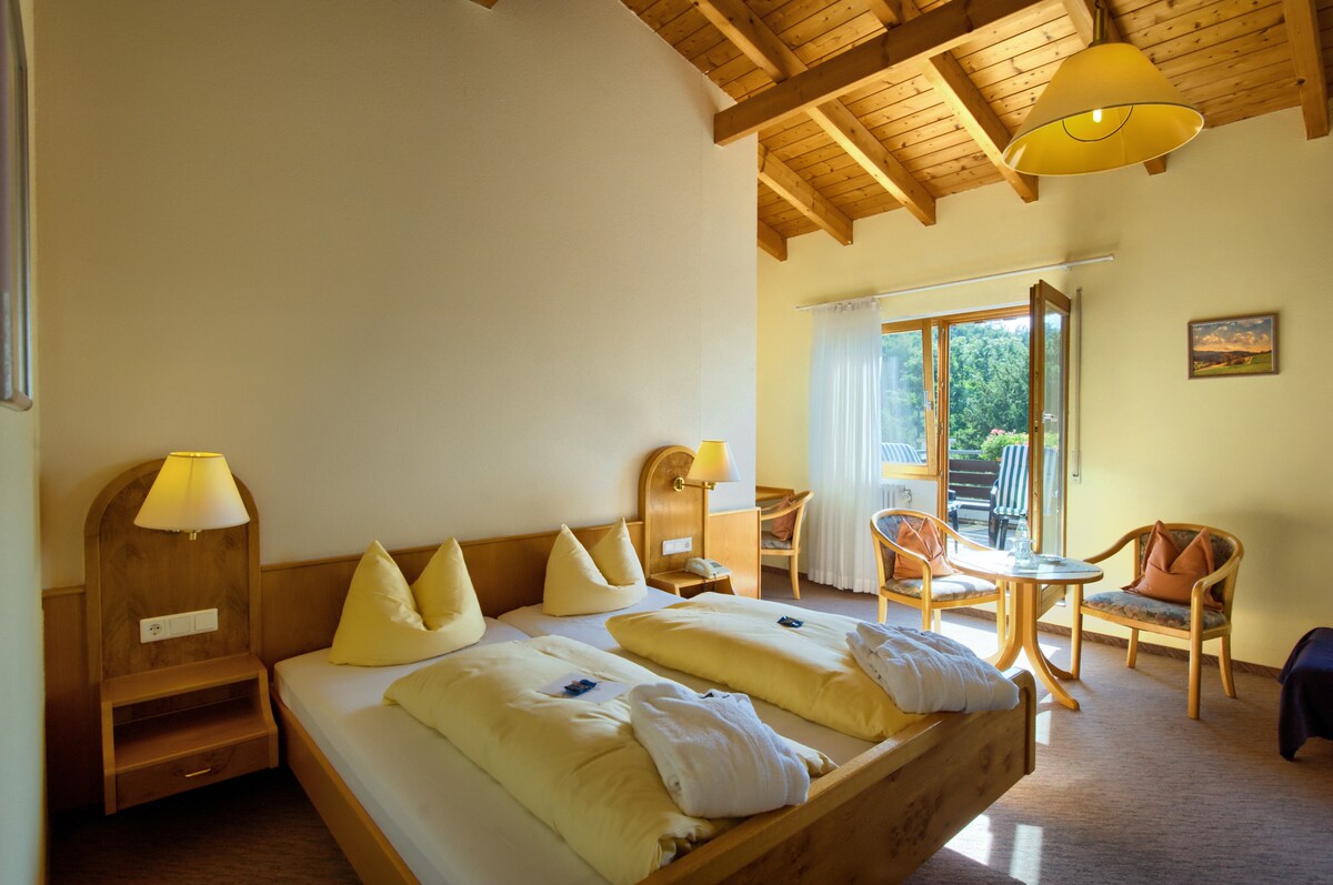 Double beds, partly twin room with balcony, satellite TV, telephone, view of the countryside, garden side or mountain side, desk, wardrobe, shower/toilet, sink, hairdryer. Size 25-30 sqm.
