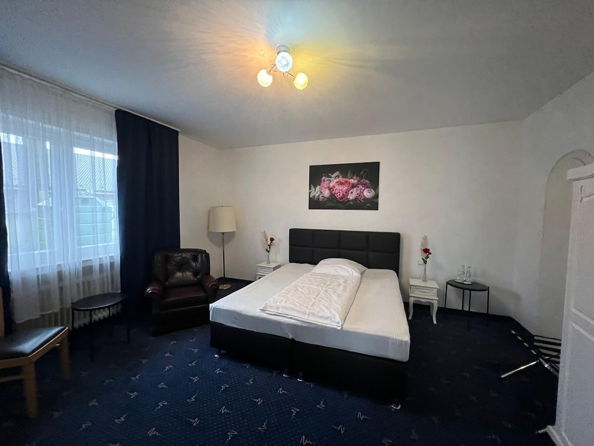 Our spacious double rooms are designed for a short to medium stay and have a cozy queen-size bed. High-quality bedding and cotton linens ensure a good night's sleep. Your private bathroom is equipped as follows: bathtub or shower with rain shower head, free toiletries and hair dryer.