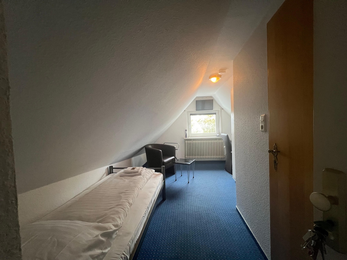 Our modern single rooms are designed for a short to medium stay and have a cozy single bed. High-quality bedding and cotton linens ensure a good night's sleep. Your private bathroom is equipped as follows: bathtub or shower with rain shower head, free toiletries and hair dryer.