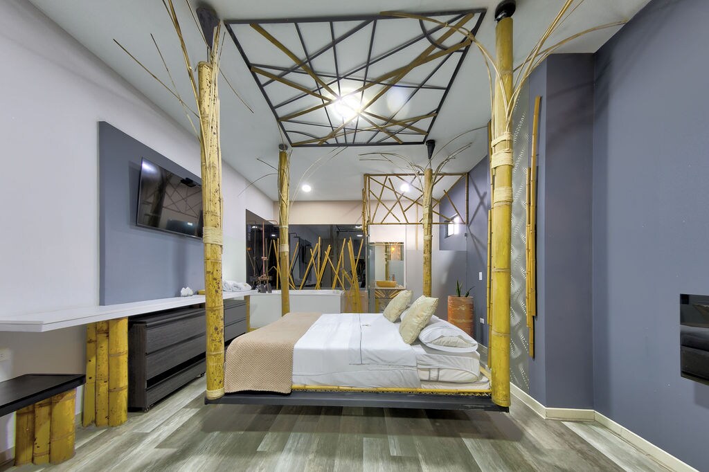 This Swing Suite is specifically designed for a once-in-a-lifetime movement experience. Includes Jacuzzi and a Queen bed with a suspension system that allows you to swing, adding a dynamic dimension to the stay.