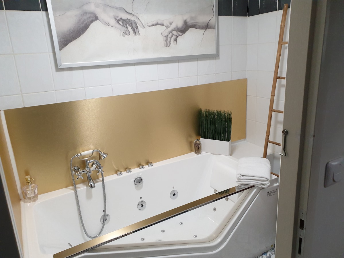 Enjoy a unique stay in our apartment with a retro-chic atmosphere, featuring a private spa for moments of absolute relaxation.