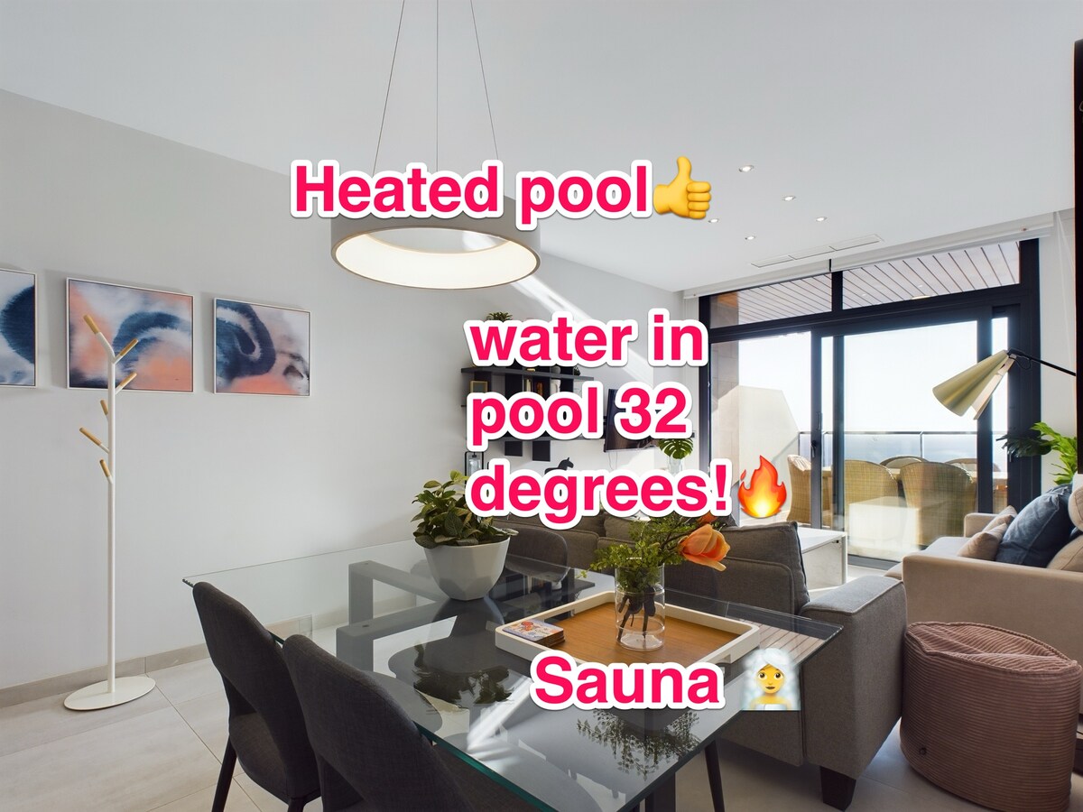 A cozy 2-bedroom apartment with a kitchen and dining room, two spacious bedrooms and two bathrooms. Each room has a TV. The balcony has beautiful views of the sea. In the gated area there is a heated swimming pool where you can enjoy your holiday at any time of the year. There is free parking place for our guests. Perfect place for a comfortable stay and rest!