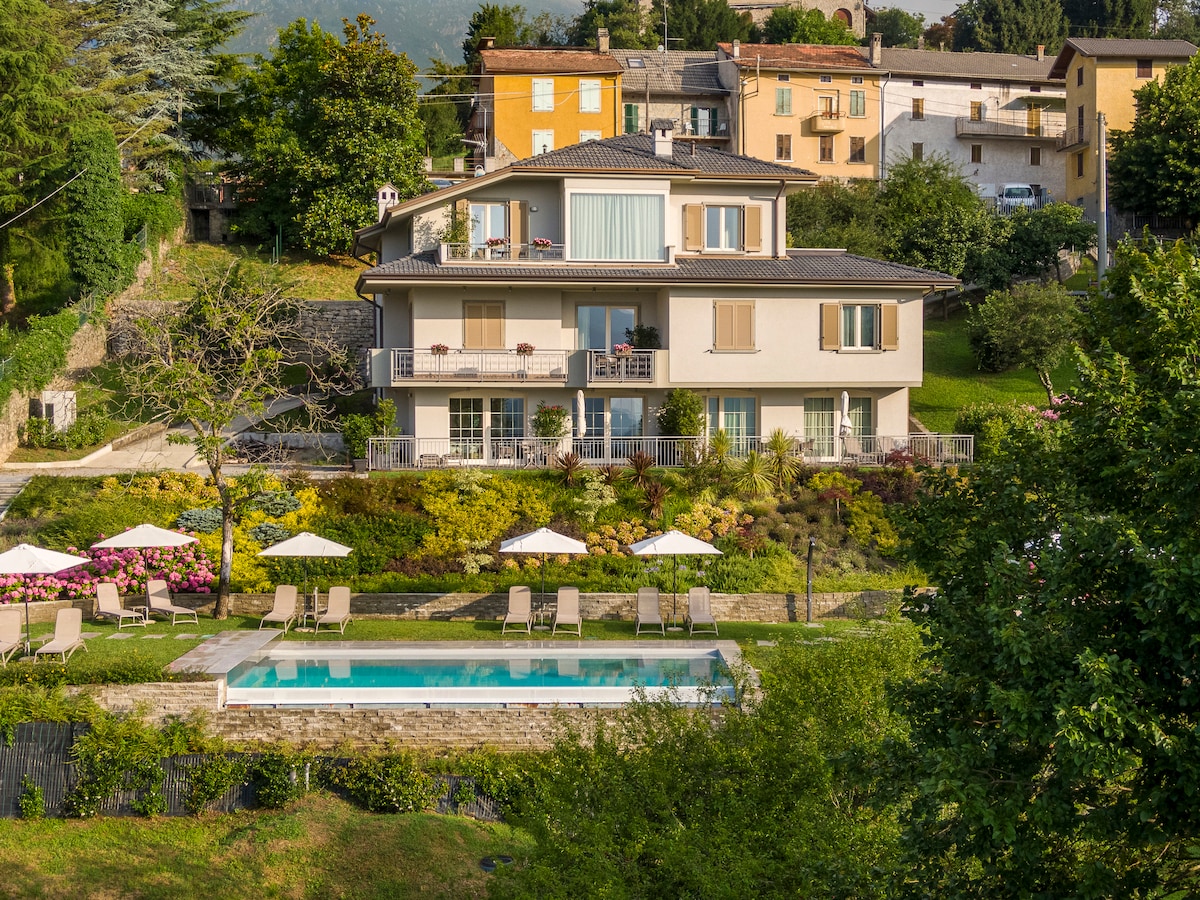 1 double bedroom with panoramic window with bath/bidet/WC, hydro massage bath, TV and air conditioning. Exit to the terrace. 1 double bedroom with 1 french bed (140 cm, length 190 cm), shower/bidet/WC. 1 double bedroom. Exit to the terrace. Open kitchen (oven, dishwasher, 4 induction hot plates, 5 gas rings, toaster, kettle, electric coffee machine, Capsules for coffee machine (Nespresso), cooking island, combination microwave) with double hand-basin. Shower/bidet/WC, sep. WC, hydro massage bath. Heating. Parquet floors, natural stone floors. Large terrace, garden, lawn. Terrace furniture, barbecue, deck chairs (6). Very beautiful panoramic view of the lake and the mountains. Facilities: washing machine, iron, children's high chair, baby cot, hair dryer. Internet (WiFi, free). Please note: fridge without freezer, non-smoking house. Maximum 1 pet/ dog allowed. Private entrance. No mandatory extra charges to be paid on-site.