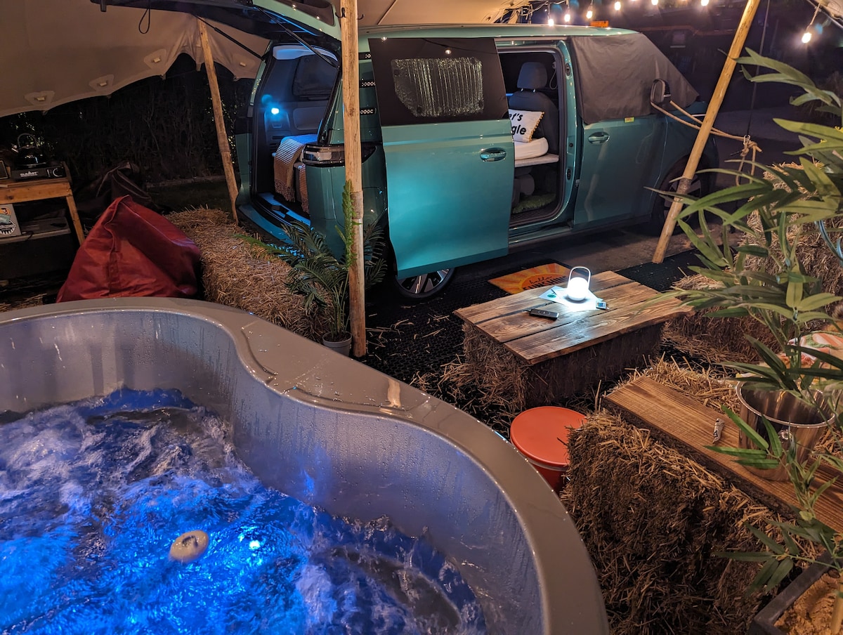 This VW ID BUZZ has been designed as a black out sleeping pod, with a fully undercover unique setup including our premium woodfired Hot tub.