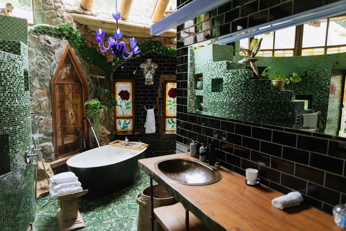 The ground floor bathroom has an extra large bathtub, mahogany furnishings, thick pile carpets and classic Victorian fittings that compliment the tropical jungle radiating through the large sash windows.