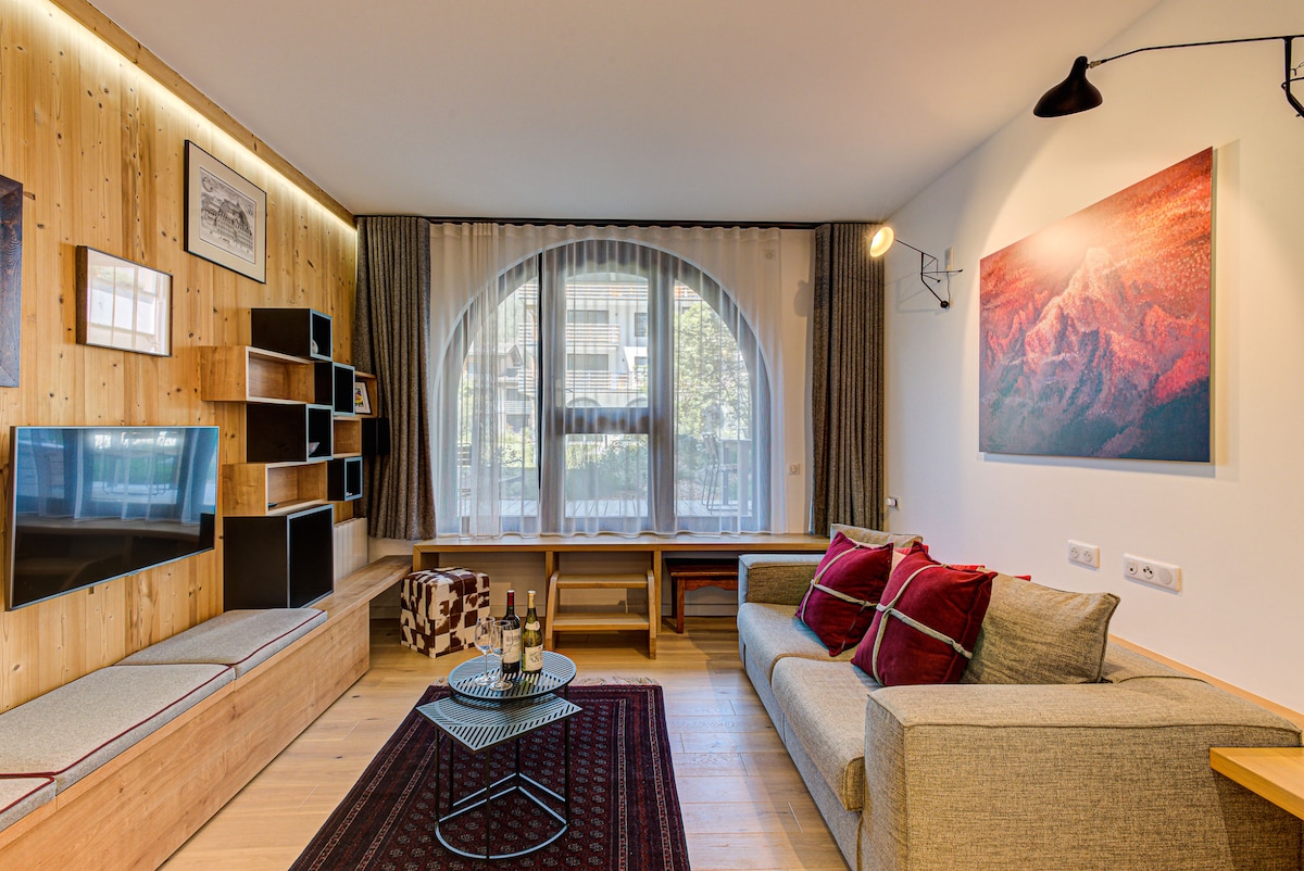 The open-plan kitchen and dining area is perfect for sharing meals and laughter with loved ones. Gather around the custom granite table or the leather banquette, with extra seats at the bar. The Bolia sofa invites you to sip cocktails while taking in Mont Blanc’s grandeur or the stunning sunset.