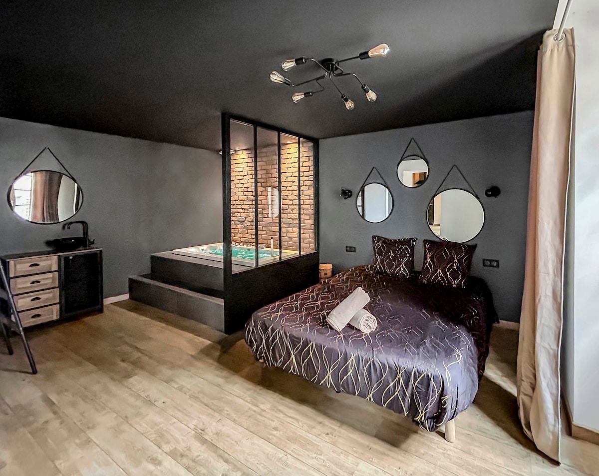 Treat yourself to a romantic break in the TIJUGO loveroom in Clermont-Ferrand: relax in a private jacuzzi, rest in an ultra-comfortable king-size bed, and enjoy a customizable bright atmosphere, autonomous and discreet access via digital code. Enjoy a smart TV with Netflix, a fully-equipped kitchen, games for couples and accessories to spice up the evening. A cocoon designed for lovers, in the heart of the city, for a romantic and unforgettable stay for two.