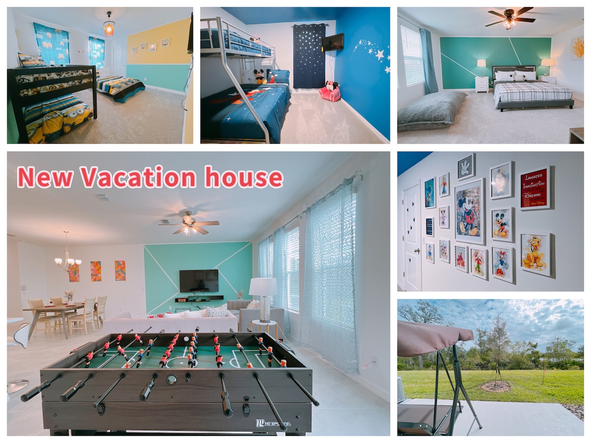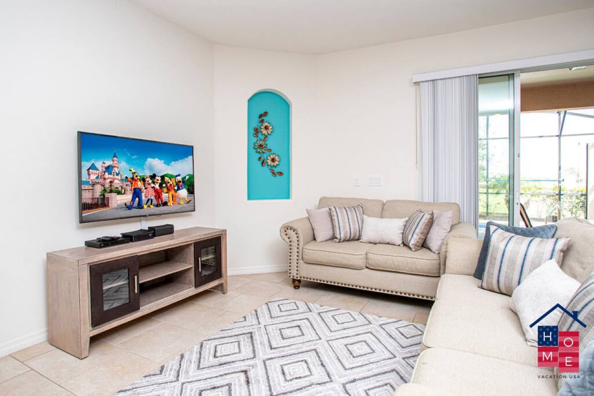 No stair climbing required in this one-level home! Perfect for families, this home can sleep up to 10 guests at a time. The primary bedroom has a view of the pool, large walk in closet and smart TV. Kids will love the decorations in their bedrooms, featuring beloved characters from the movies the Minions, and Harry Potter. Plus there are 3 bathrooms so nobody needs to wait in line in the morning.
