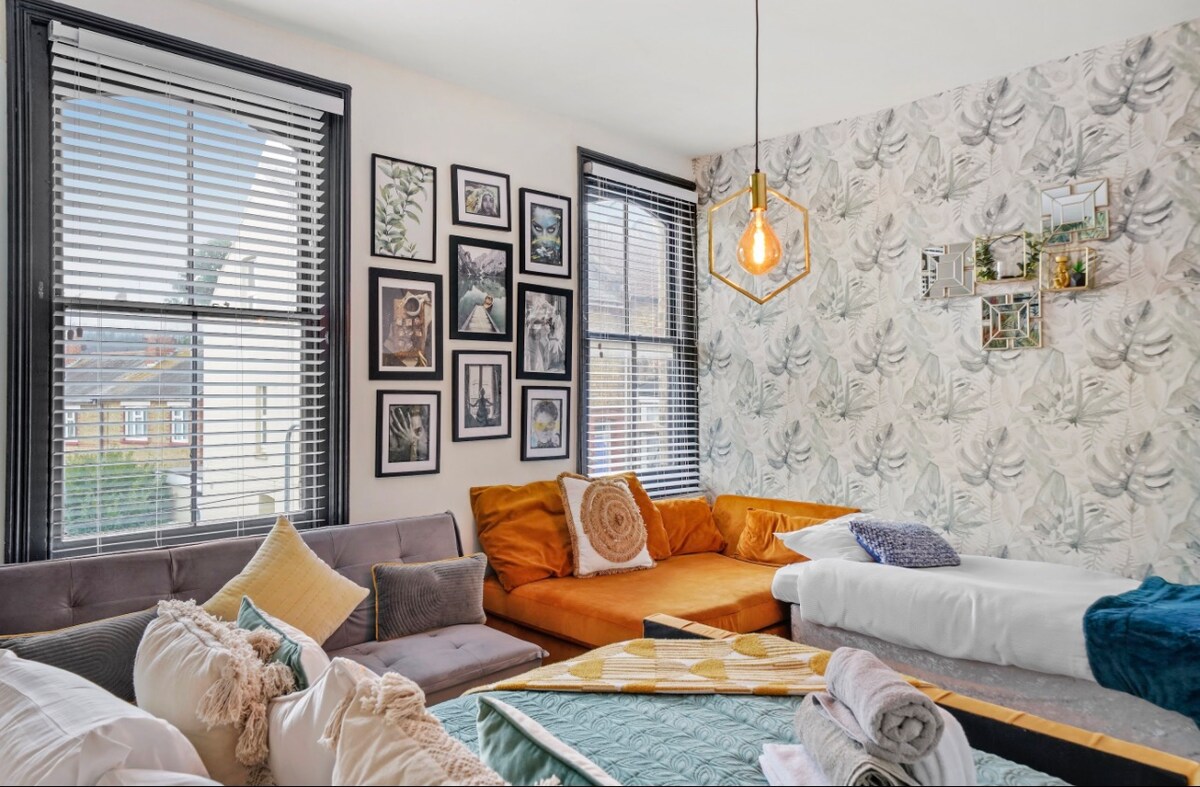 A large detached studio with private garden and decking areas decorated with bohemian style decor. Lots of luxuries here to make your stay a memorable one . Dressing gowns, outside shoes, electric blanket, rechargeable candles , shampoo, bath products and an Alexa Show as well as a Bluetooth speaker with mood light Ceiling mounted Smart TV the rotates so it can be watched from the beautiful Chesterfield sofa or watch a movie in bed.