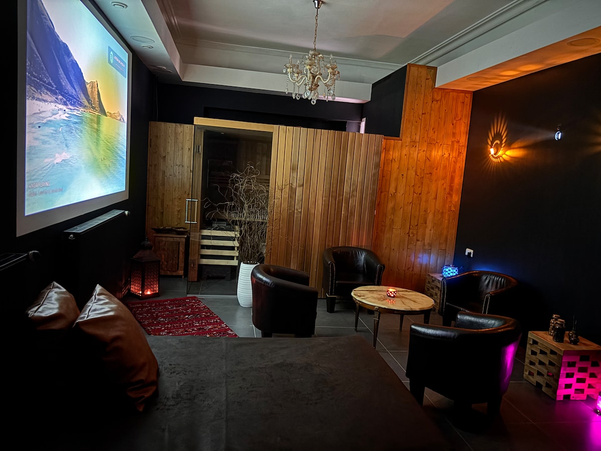 This haven of peace will offer you a wellness break thanks to its relaxation area, consisting of a 3-seater Spa with multi-jets, a traditional sauna with hot stones, a connected TV corner/Bluetooth soundbar, and a double walk-in shower.