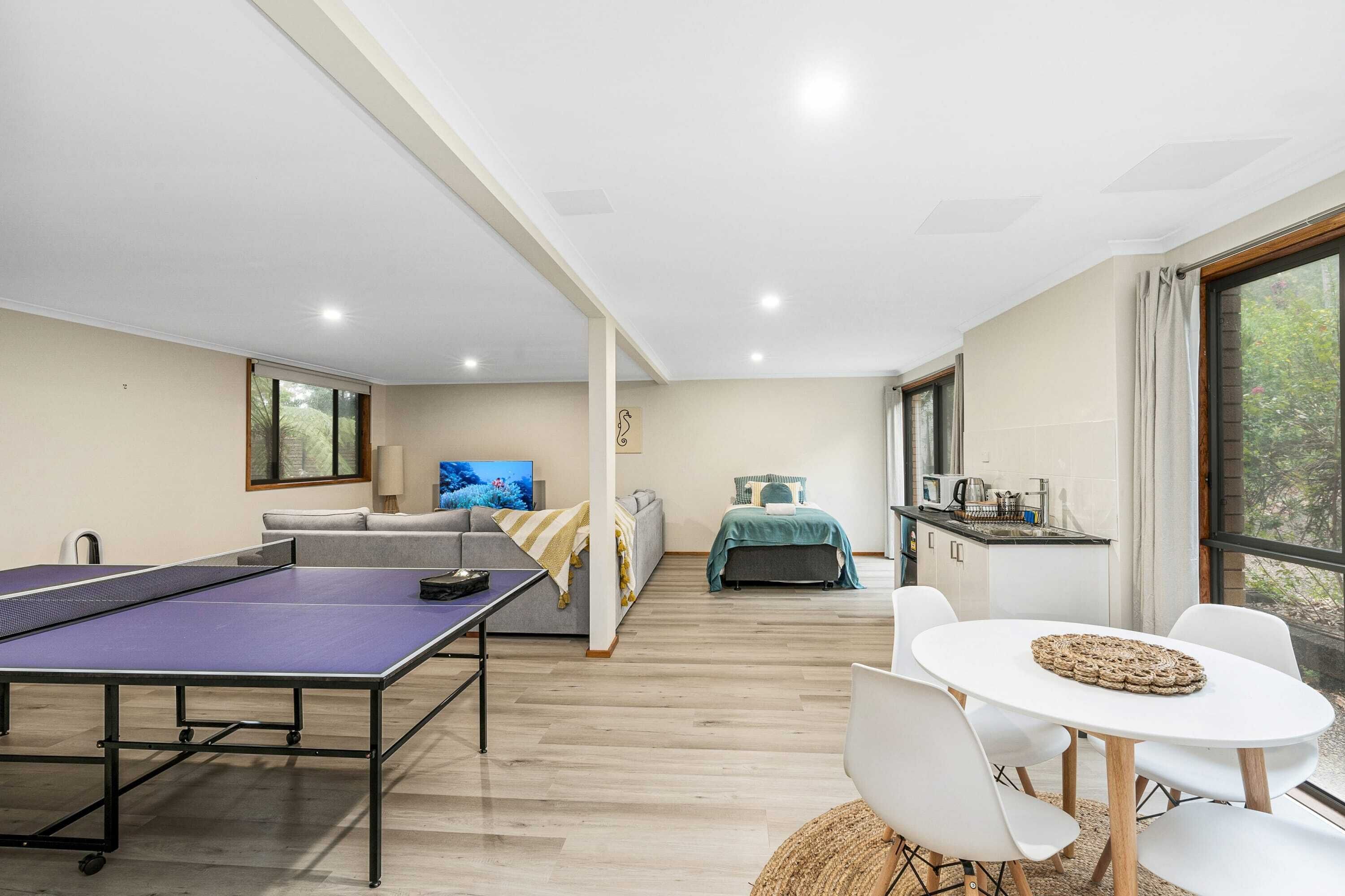 Inside, the spacious master suite boasts a king-sized bed, a walk-in robe, and an ensuite with a double shower and vanities. Three additional well-appointed bedrooms (1 king, 2 queens) provide ample space for families or groups. The theatre room, complete with a fold-down double Murphy bed, ensures hours of family entertainment, while a table tennis table offers friendly competition.