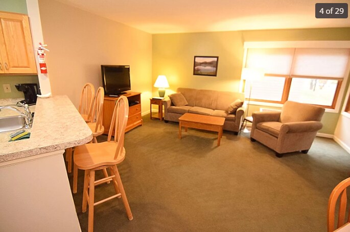 One bedroom condo at Pollard Brook in Lincoln, NH . This is a great condo that comfortably sleeps 4.