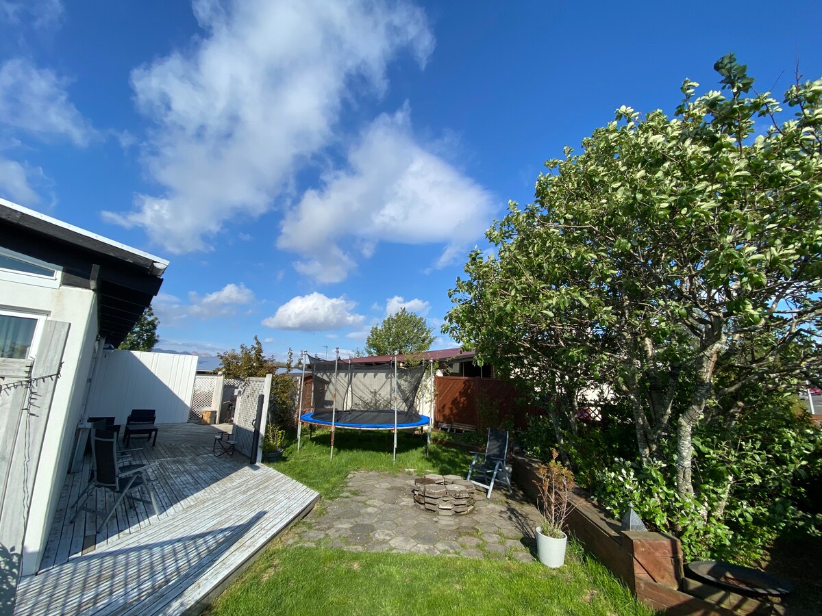 A peaceful family home with a view on Esja mountain (a popular hike). From the kitchen you can walk out to the patio and fenced garden where there is a hot tub and a large trampolin. The family cat lives outside in the garden.