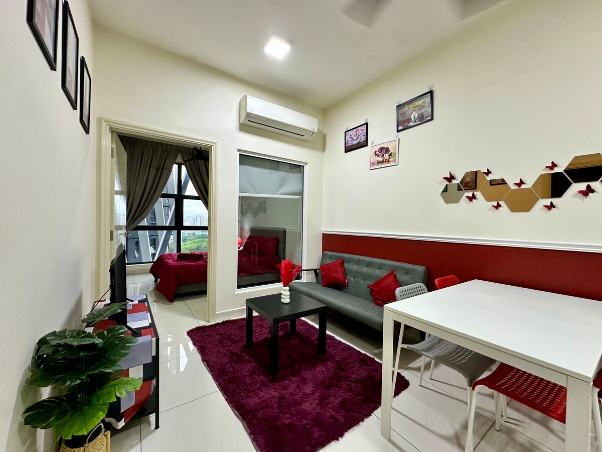 Welcome to Crimson Haven, a chic urban retreat at Arte Mont Kiara. This modern red-and-grey-themed 1+1 bedroom apartment is perfect for couples, solo travelers, or small families. The cozy space is designed for comfort and convenience, ideal for relaxing or working.
