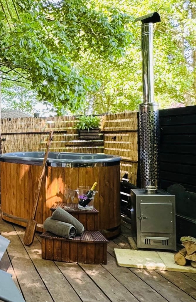 Wood-fired hot tub — no jets, no lights, just you, the warmth of the fire, and the stars.