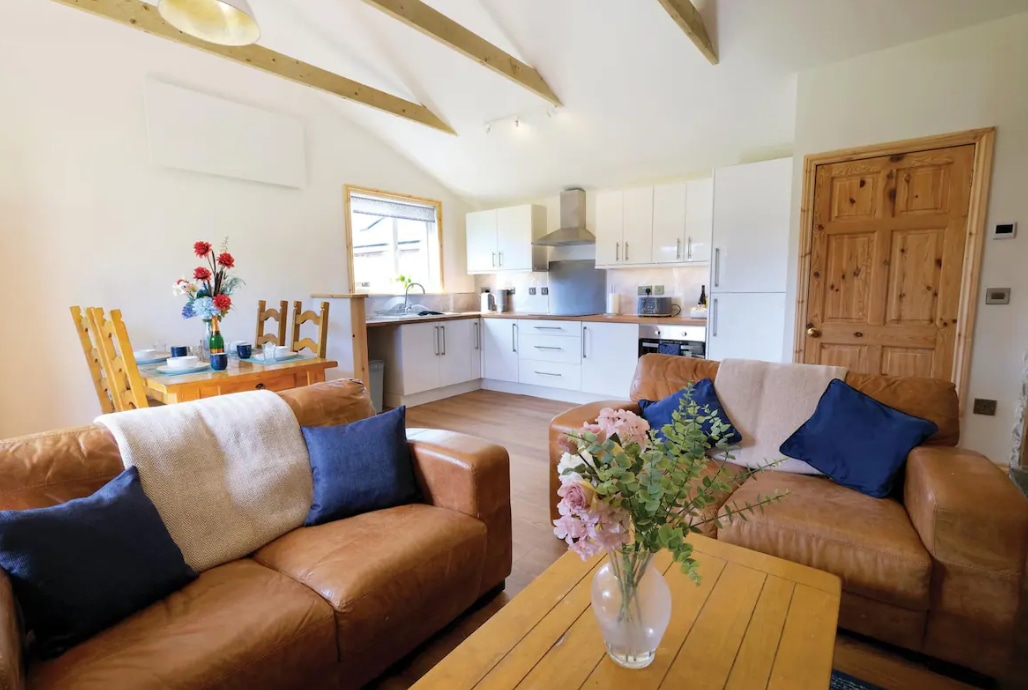 Upon entering, you’re greeted by a spacious open-plan kitchen, dining and living area. The fully equipped kitchen includes an electric oven, induction hob, fridge/freezer and dishwasher, complemented by a four-seater dining table. The elegant living room features a plush sofa and a Smart TV, while the luxurious super-king bedroom comprises ample storage and an en-suite bathroom, complete with a shower and bath. Outside, enjoy the enclosed garden with a hot tub and convenient outdoor shower.