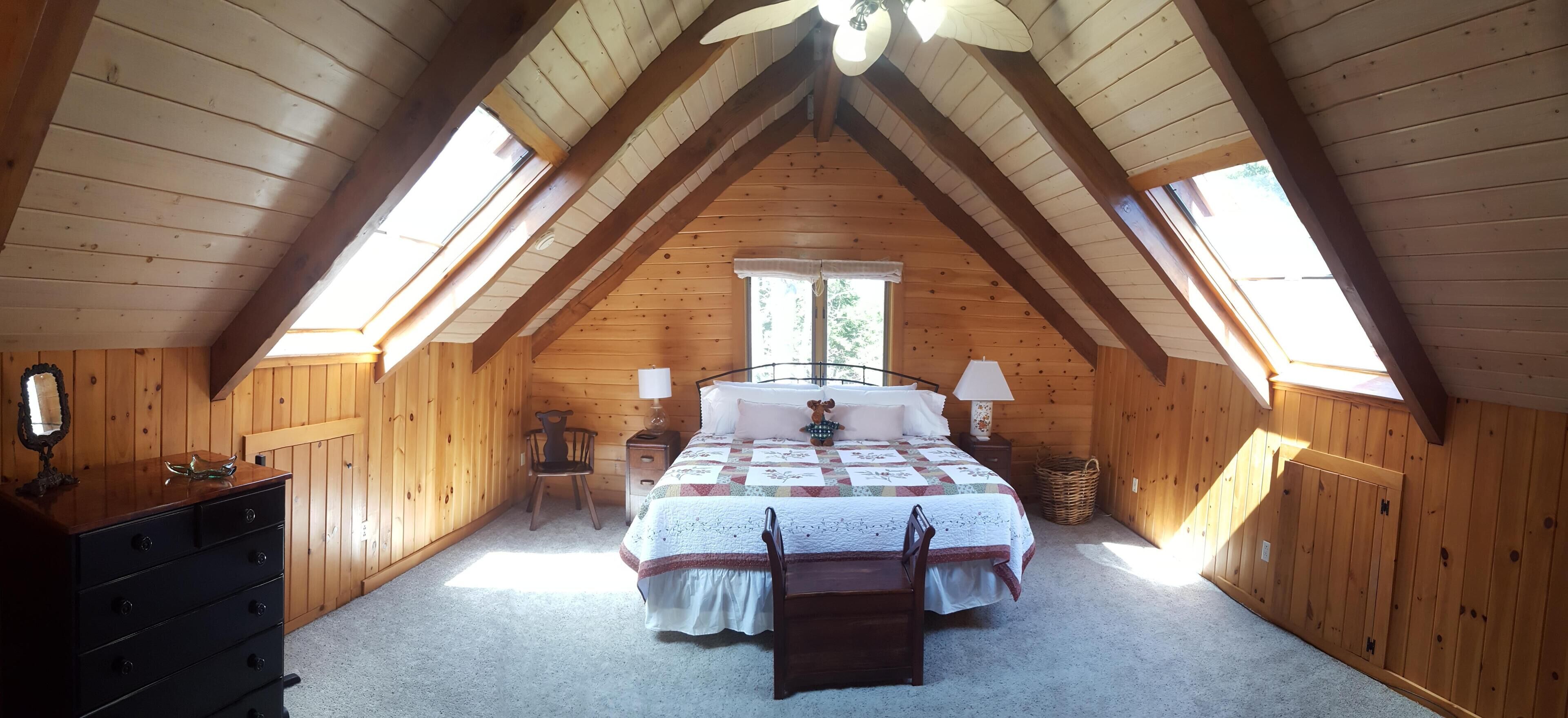 There are two bedrooms, both with queen-size beds, plus a queen-size pull-out couch with memory foam mattress in the living area and a full size futon couch / bed in the back reading room. The reading room can be closed off for privacy. There are two full bathrooms, both with showers and tubs, one upstairs and one down.