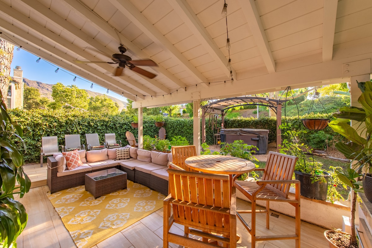 Unwind in style at this beautiful 5 bedroom, 3 bathroom home nestled in the serene hills of Agoura. Designed for comfort & togetherness, this spacious home sleeps up to 10 guests- ideal for two families or a large group vacationing together. Wake up to mountain views & sip your morning coffee on the front deck as the sun rises. In the evenings, relax in the pool or jacuzzi while the sun sets over the canyon—a perfect end to a Southern CA day.