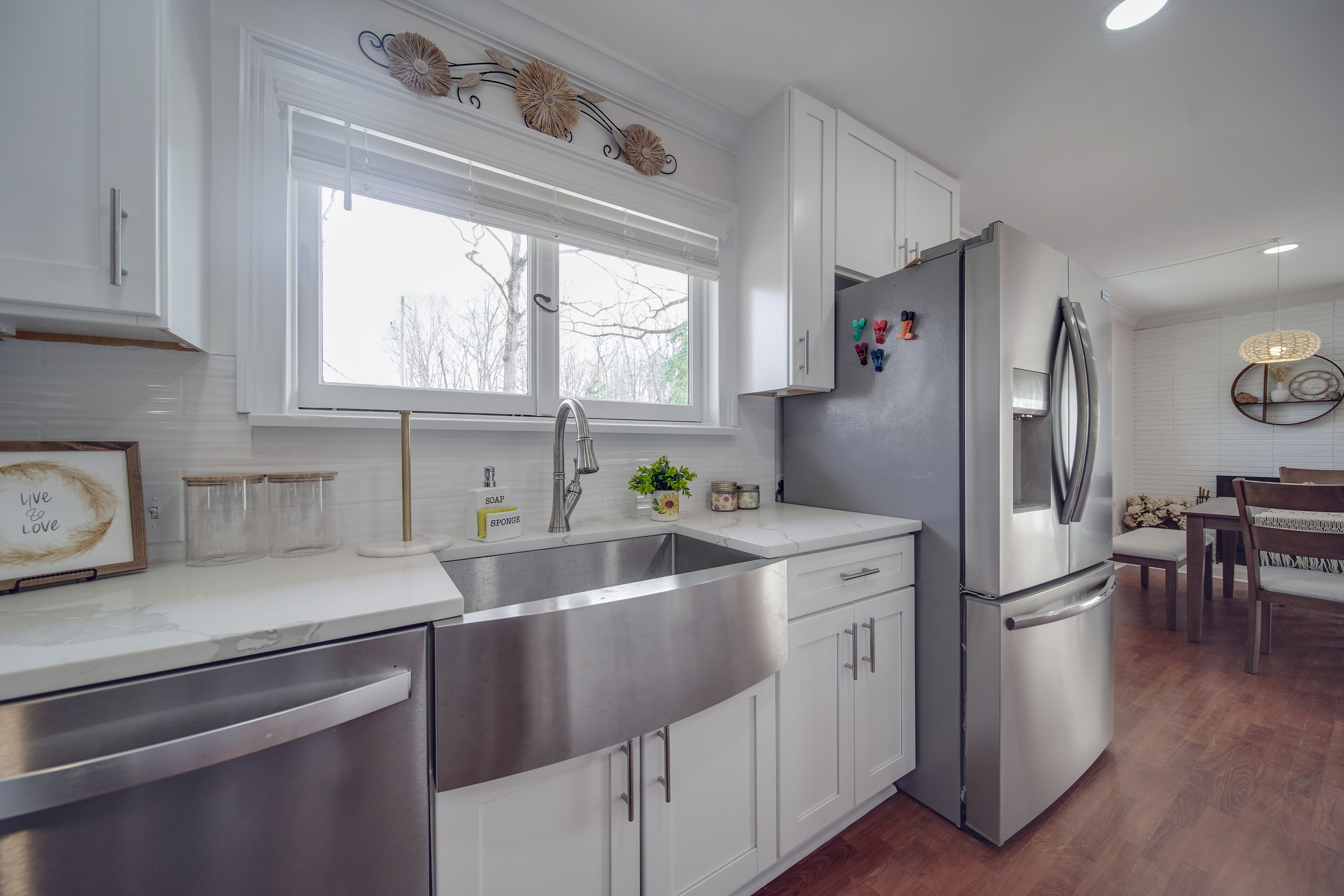 As soon as you enter this gorgeous country house, you’re welcomed by a very stylish, comfortable open concept living area with cozy décor, the open floor plan allows you to enjoy company while cooking, fully stocked kitchen along with a connected dining area for delicious meals with family/ friends. The sun shins effortlessly though the large windows Throughout the day, make the entire space bright and warm. Sit on wraparound deck viewing the peaceful land, breathe the fresh country air, listen to the birds and whispering bubbling creek a stone’s throw away from the deck.