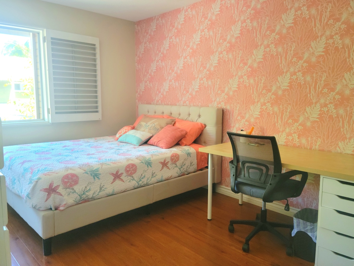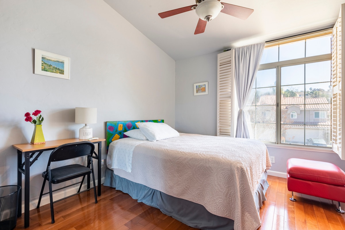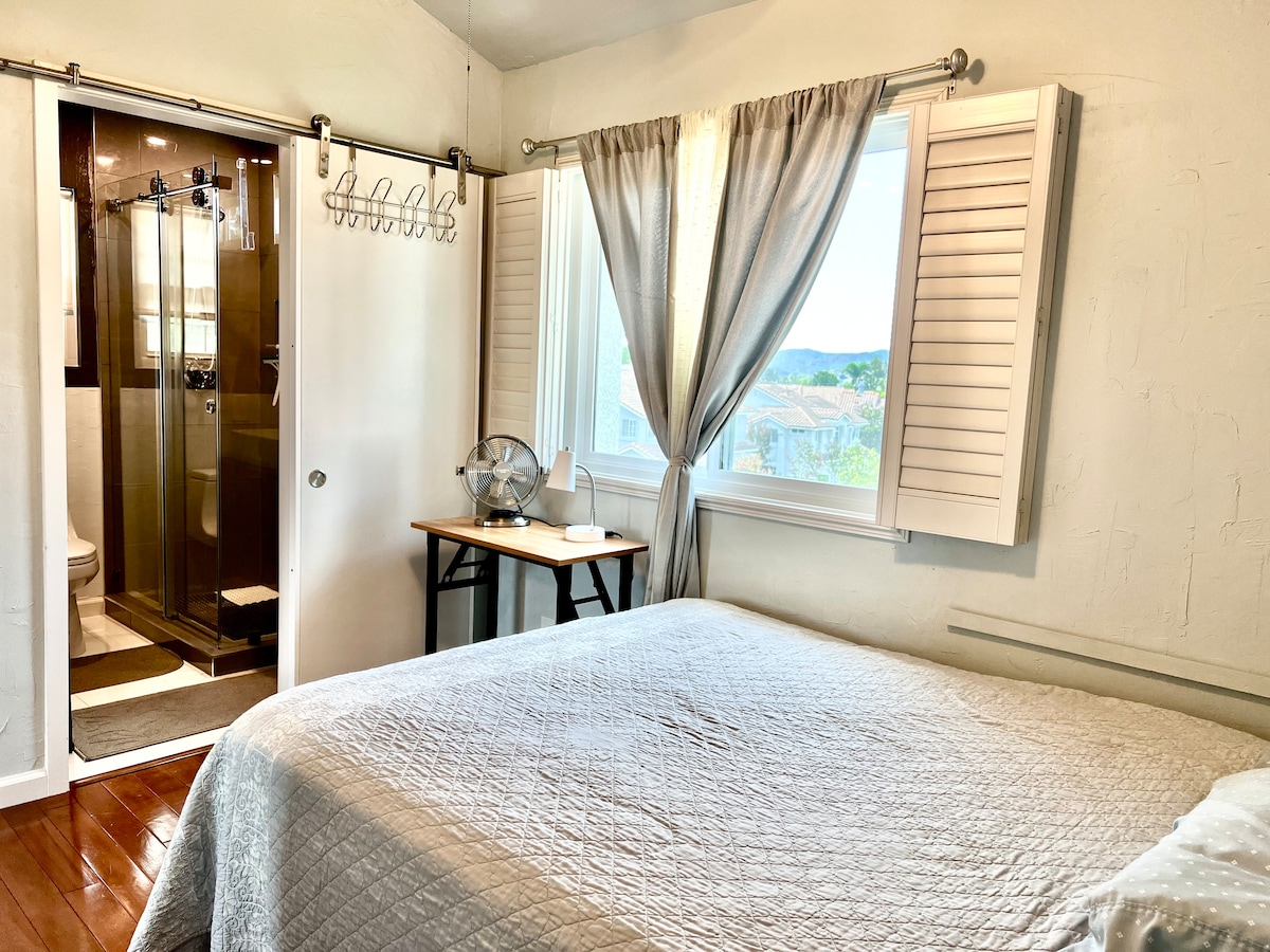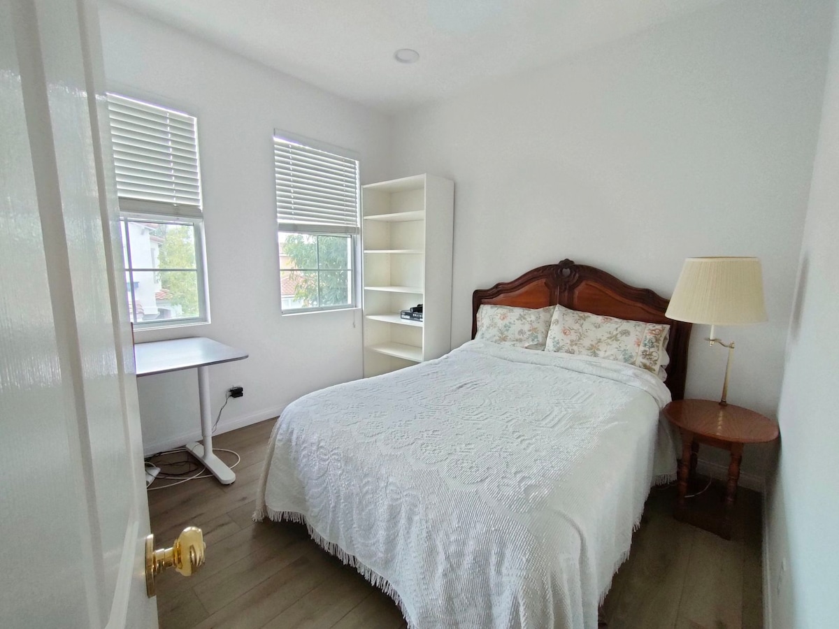 Great location near the major high tech companies in South Orange County. This bedroom has a private shower/toilet/sink inside the room, that is ideal for business travelers, travel nurses, adventures and tourists. The room is a bedrooms for resting and is not furnished for work space and is not rented to those want to work from home. Must respect the others comfort zone. This furnished bedroom is on the second floor, a high quality mattress. The bedroom has wooden floor, closet, and ceiling fan. Full access to living room Netflix, prime video. Fireplace in living room, full access to kitchen (light cooking only and no to strong smell cooking, no to curry,no to fresh garlic), the laundry room next to the kitchen available. A green private backyard to unwind in. 2 sets of fresh bed linen will be given to you. NO to dying hair or giving haircut to yourself in this house. This cozy home is colorful, artistic and friendly and family oriented hostess lives in the master bedroom. Unlimited street parking, a quiet neighborhood, near major shopping center. Few steps to public transportation. Varieties of restaurants, markets, movie theater and more...