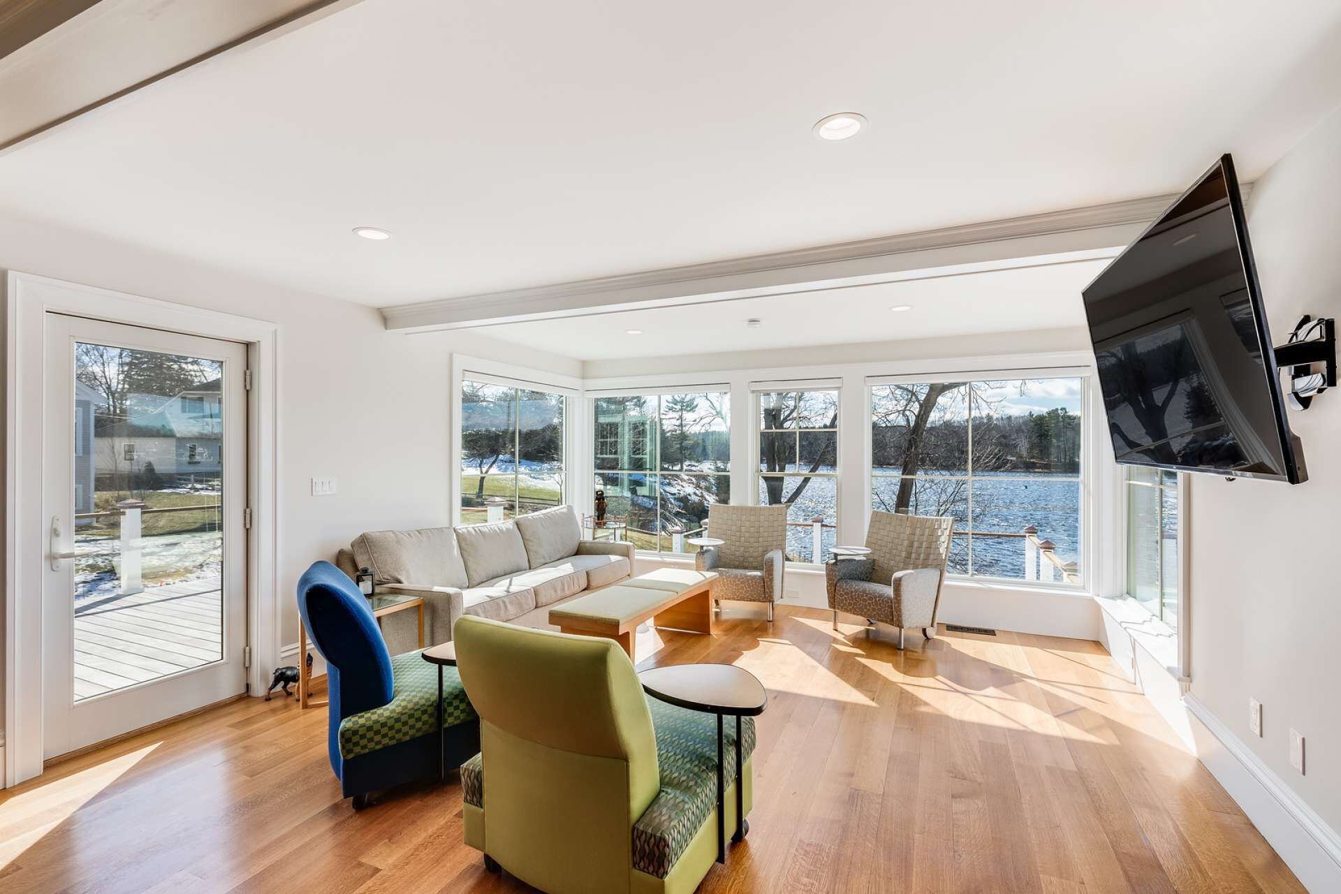 Oversized windows overlooking the Merrimack River throughout the open concept living, kitchenette and game area. Both bedrooms are tucked away from the view but are windowed and airy.