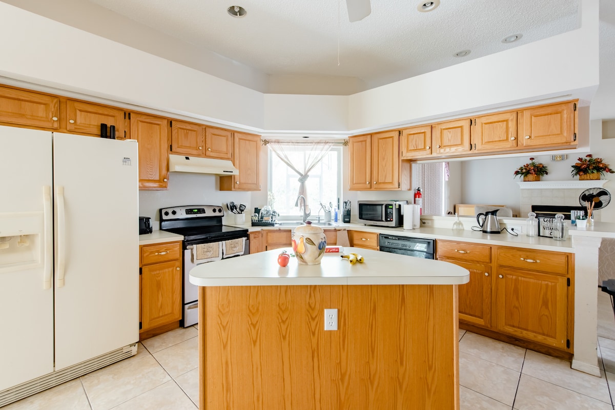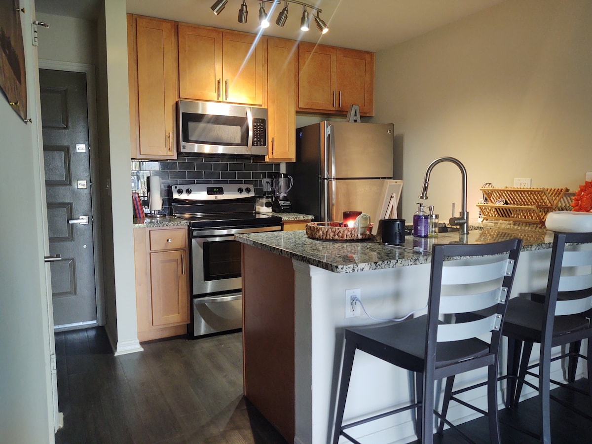 Full kitchen setup including fridge/freezer, microwave, gas stove/oven, toaster oven