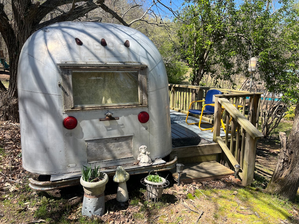 Enjoy your private porch and your private bathroom with a shower is just steps away from the airstream door, down a tiny hill.