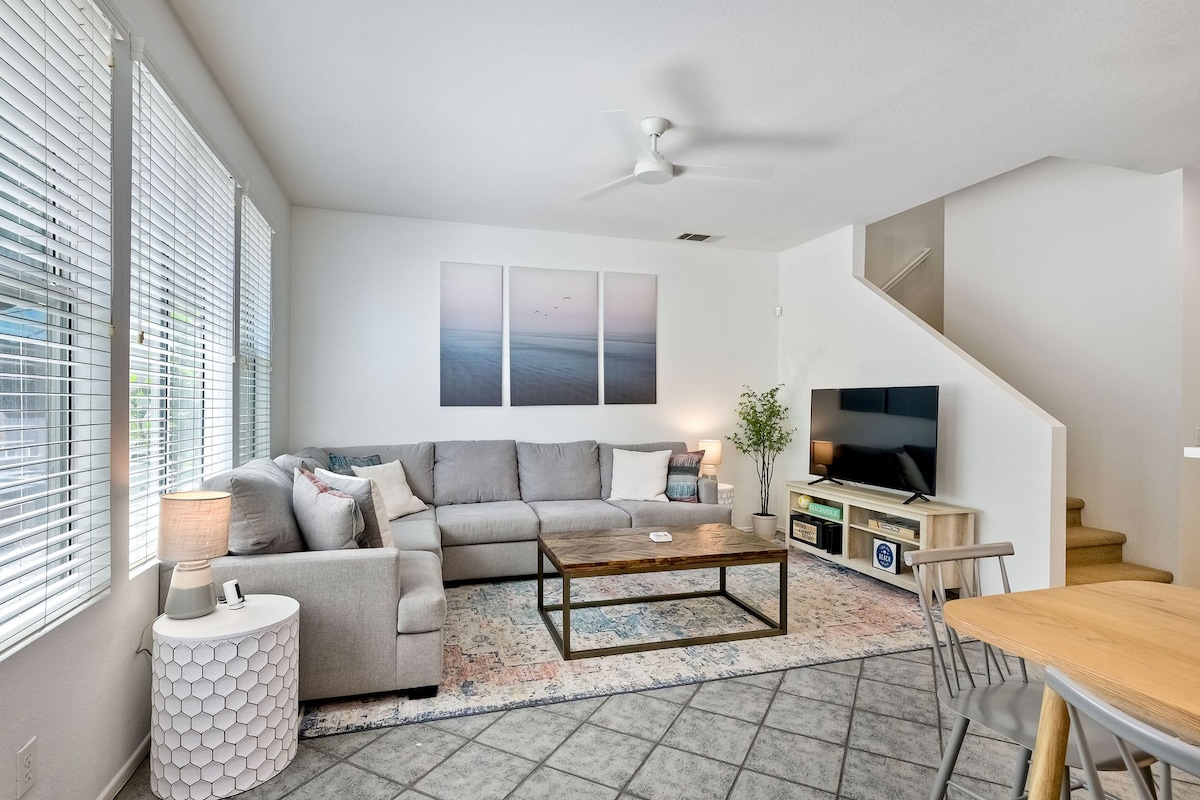 This single-level home has 3 bedrooms, 2 baths, and an open floor plan with an expansive living room with Smart TV, newly renovated kitchen, and large dining area with seating for 10.
