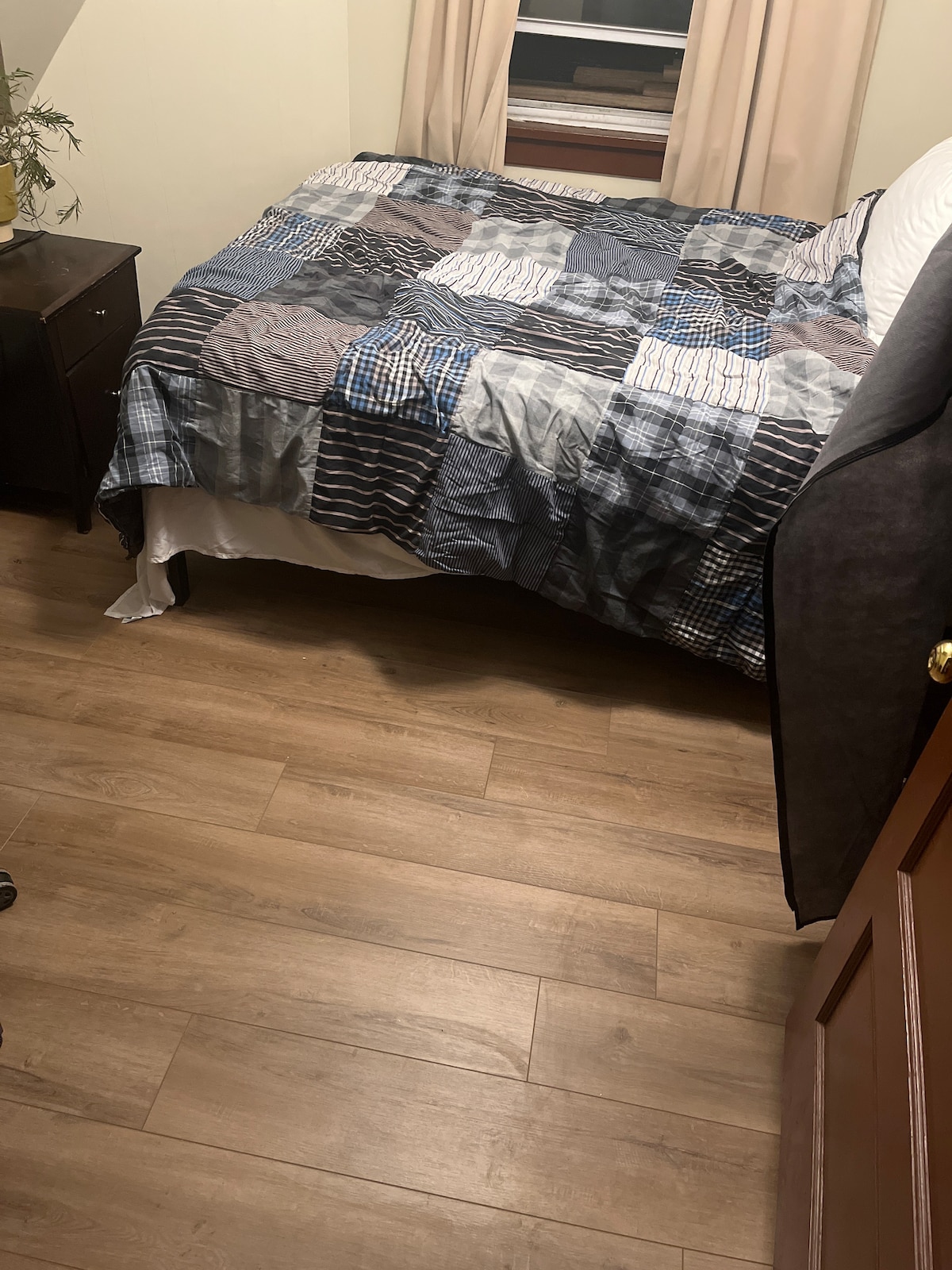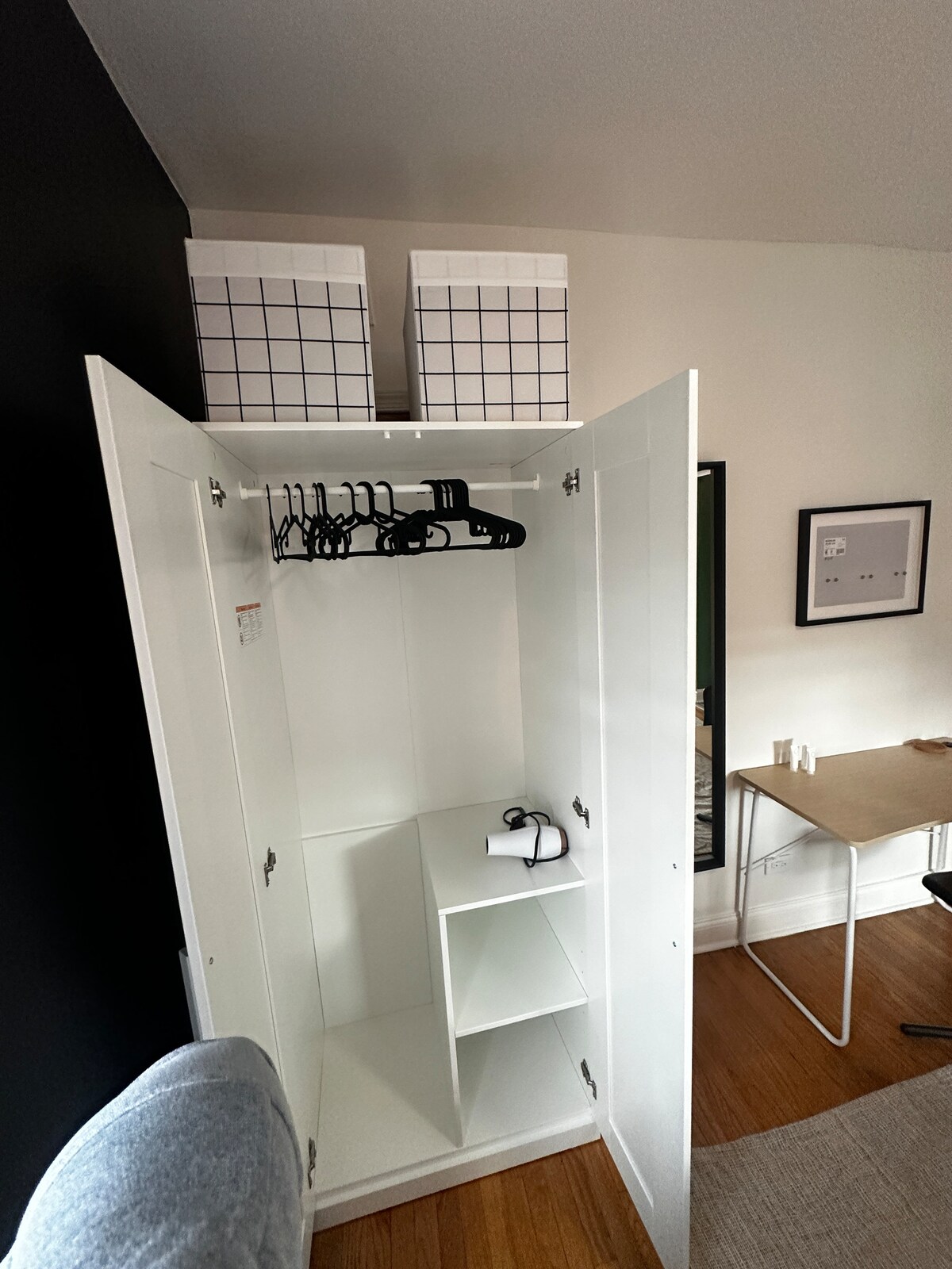 The attic apartment is located on the top of the 3 story building. Inside you find a kitchen, dining and living room in open concept design. Next to the living room you will find a small bathroom with 1 person shower. On the other end of the living room is a bedroom separated by a barn door. Inside the bedroom are bed, 2 night stands, dresser and a walk in closet with washer/dryer.