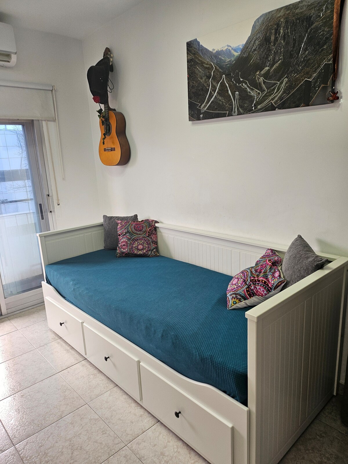 Private room with a trundle bed in a simple and family apartment with a shared bathroom and kitchen.