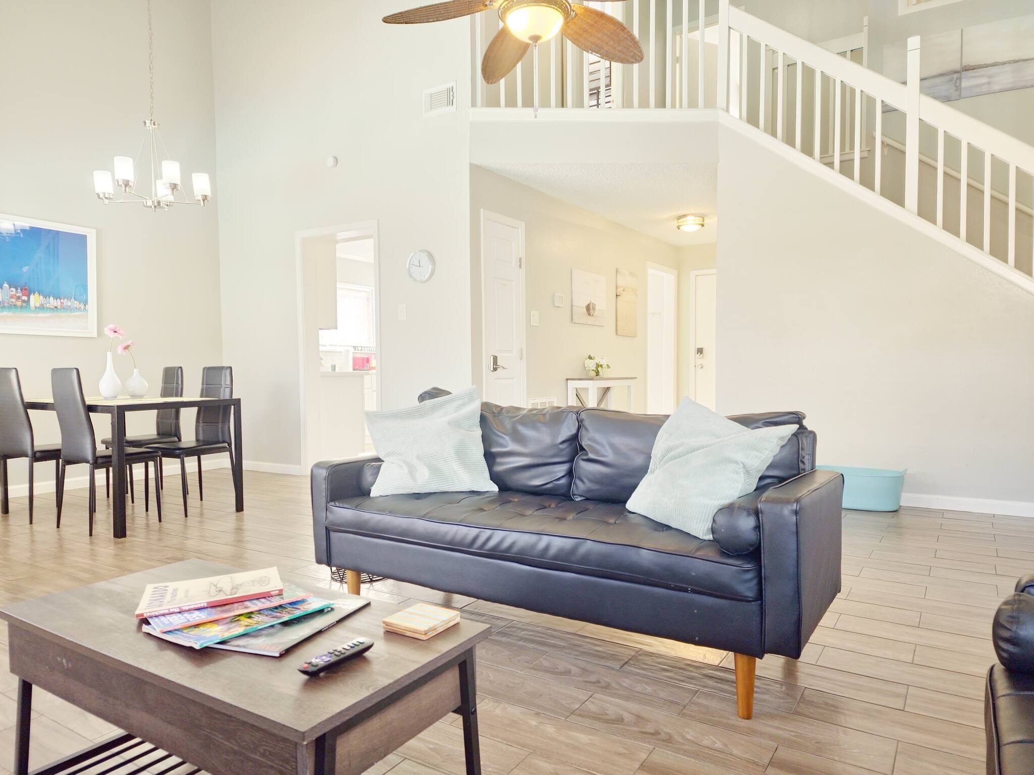 Guest(s) have access to the kitchen, dining room, and spacious backyard. There is a full bathroom next to the bedroom, and there is a half restroom downstairs next to the kitchen. We have an easy 4 digit key-less entry, so there is no need to hassle with key hand offs. There is also free parking on the premises. Privileged entrance to the club house pool is offered when available.
