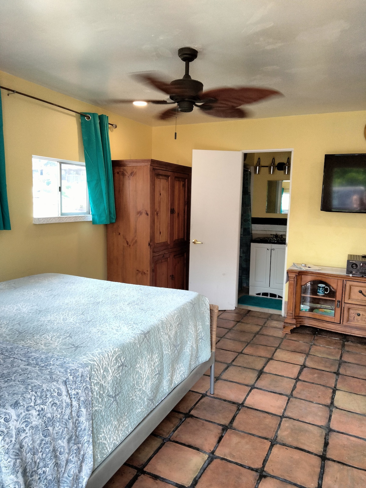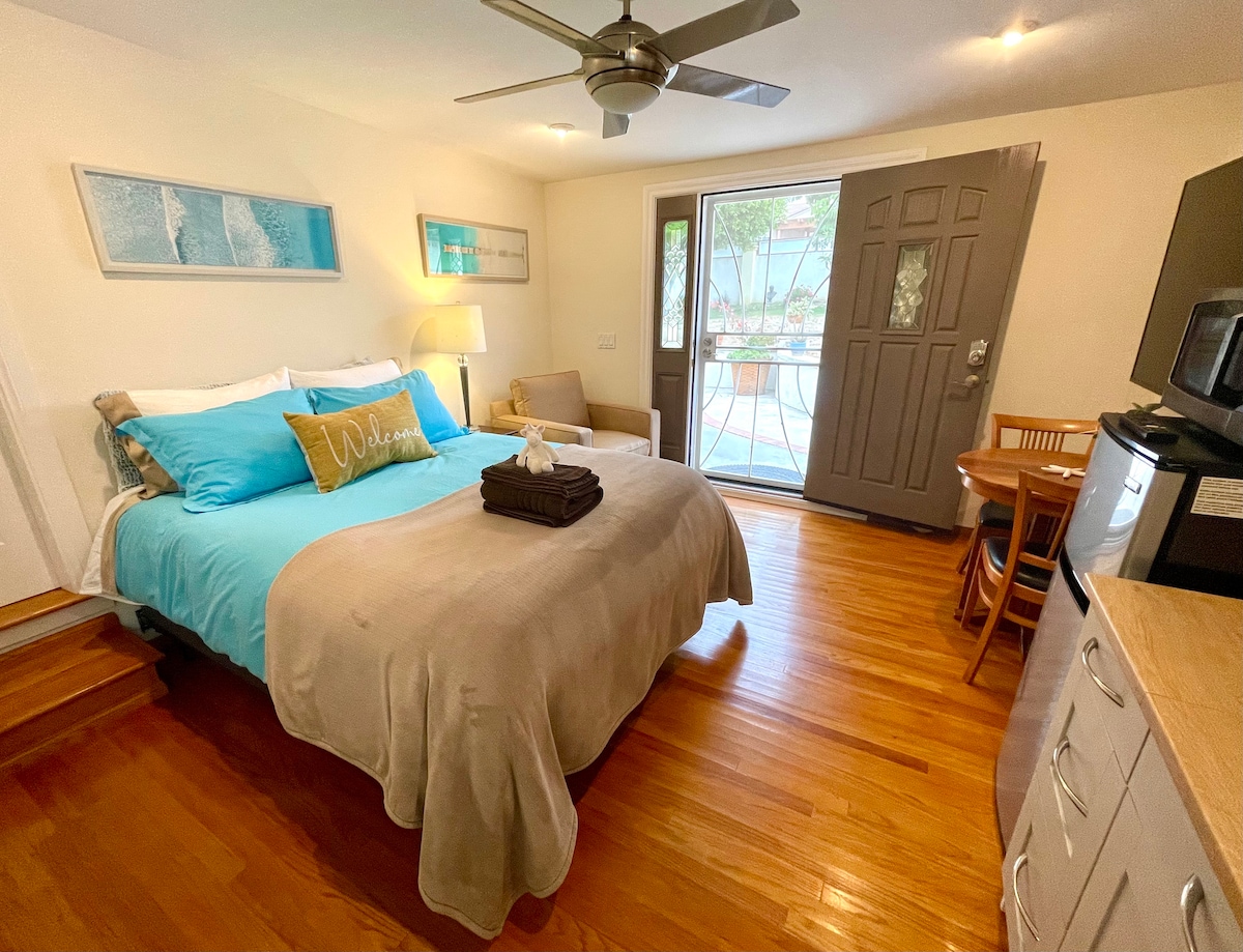 This King Bed with private en-suite is at the front of the property, has its own front door and own private bathroom with walk-in shower. The unit has its own tv with cable, Wifi, window shutters, raised ceiling, large fan, & skylight blackout shades. There are also some amenities such as a microwave, fridge, coffee maker & toaster in a small kitchenette.