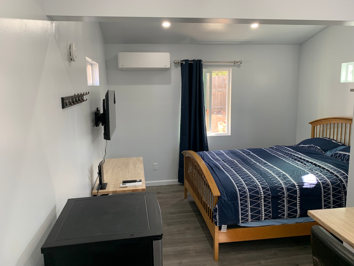 Guest suite with private entrance on private west facing patio, queen bed, in- suite private bathroom with shower/ tub. Great central location. Only a ten minute walk to East Mission Bay and a 5 minute walk to the new Blue Line San Diego Trolley. Clean and cozy with small fridge w/freezer , Keurig coffee maker, microwave , comfortable fabric chair , desk/ table , and window air conditioner.
