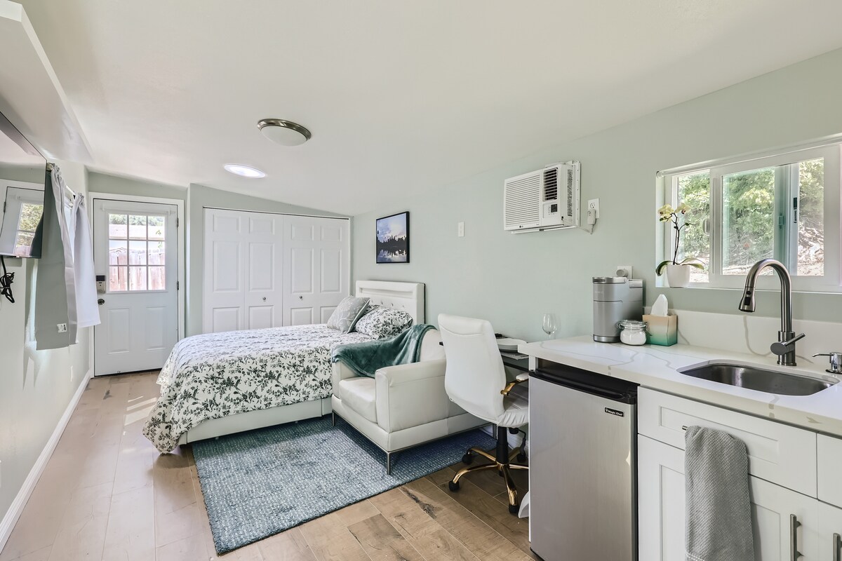 This is a spacious, well lit, convenient Bungalow. There is a King Bed in the bedroom with a Queen Murphy bed in the unit. The kitchen is new with stainless steel appliances. There are 4 skylights with great natural lighting and a whole house ventilation fan in addition to the air conditioning, There are two large flat screen TVs and free WiFi. There is a large tree shaded patio with table, chairs, swing and a grill for your enjoyment. There is a great work area with a large desk and shelves for easy workability.