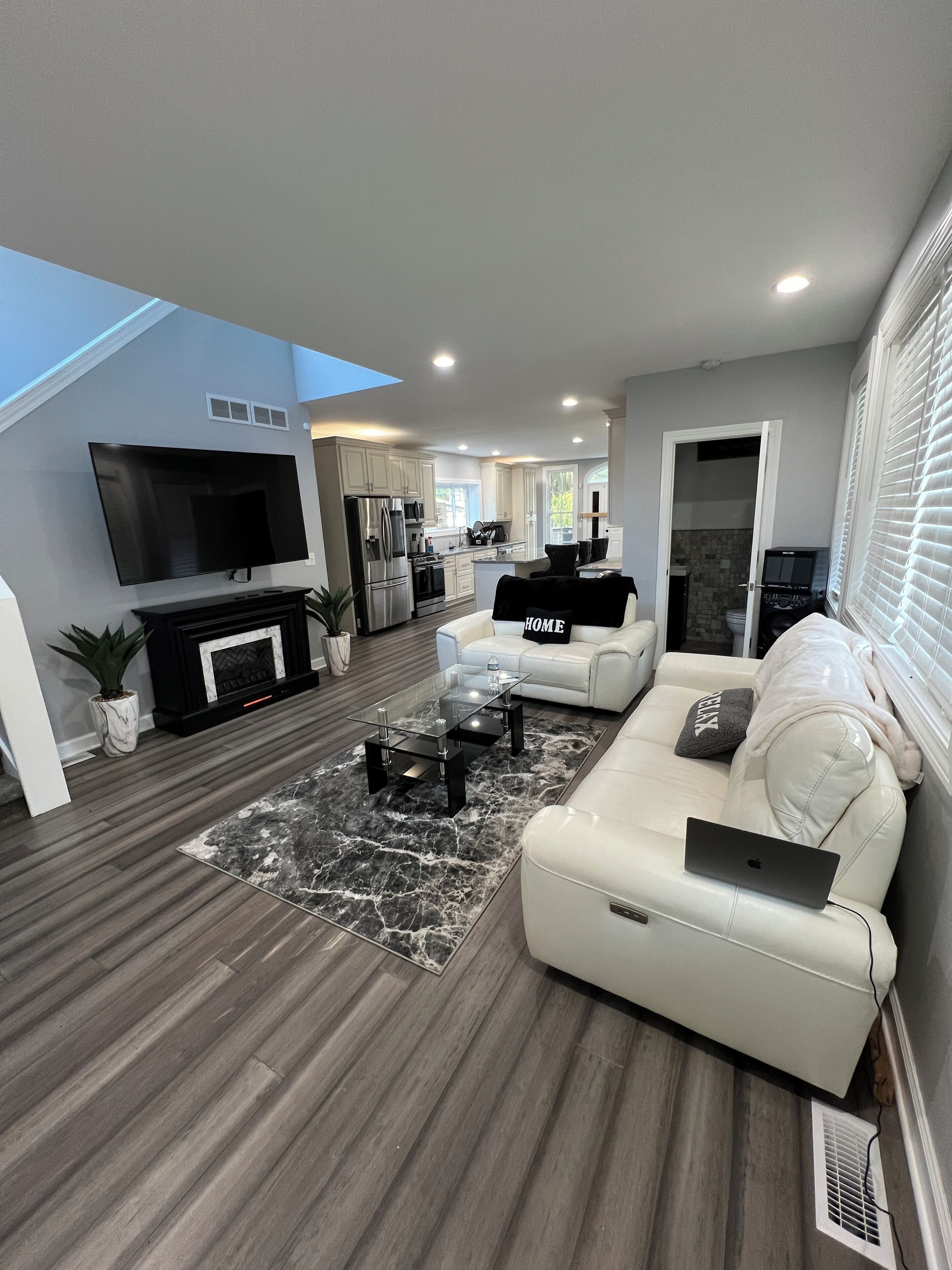 ~Living room includes Smart TV, WiFi, Amazon Fire TV, all-season electric fireplace/heater, leather couch, reclining chair & portable Bluetooth speaker.