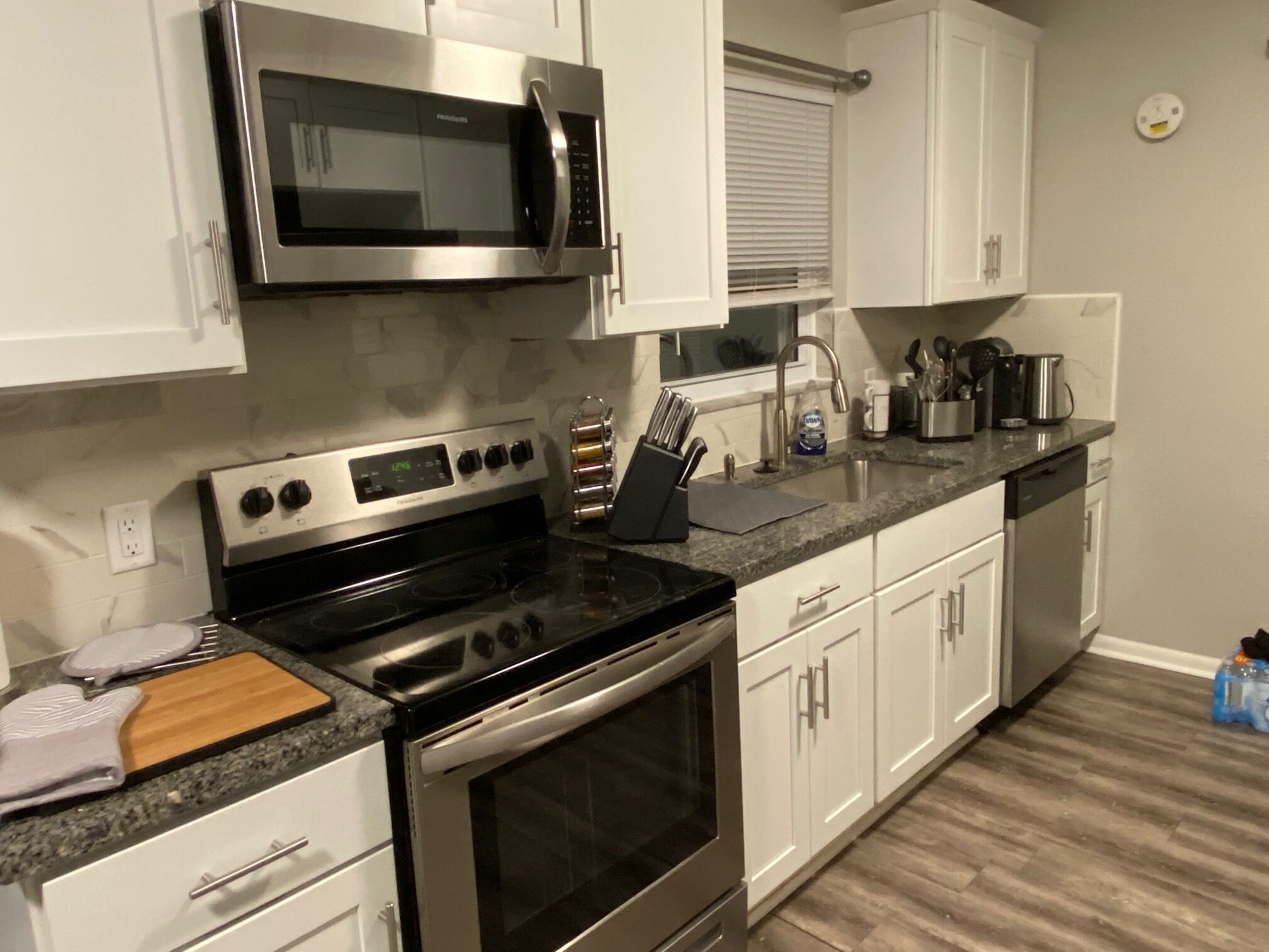 - Fully functional kitchen with dishwasher, microwave, refrigerator, and plenty of cabinet space, Keurig coffee maker, toaster, blender, cooking utensils, dishes & silverware