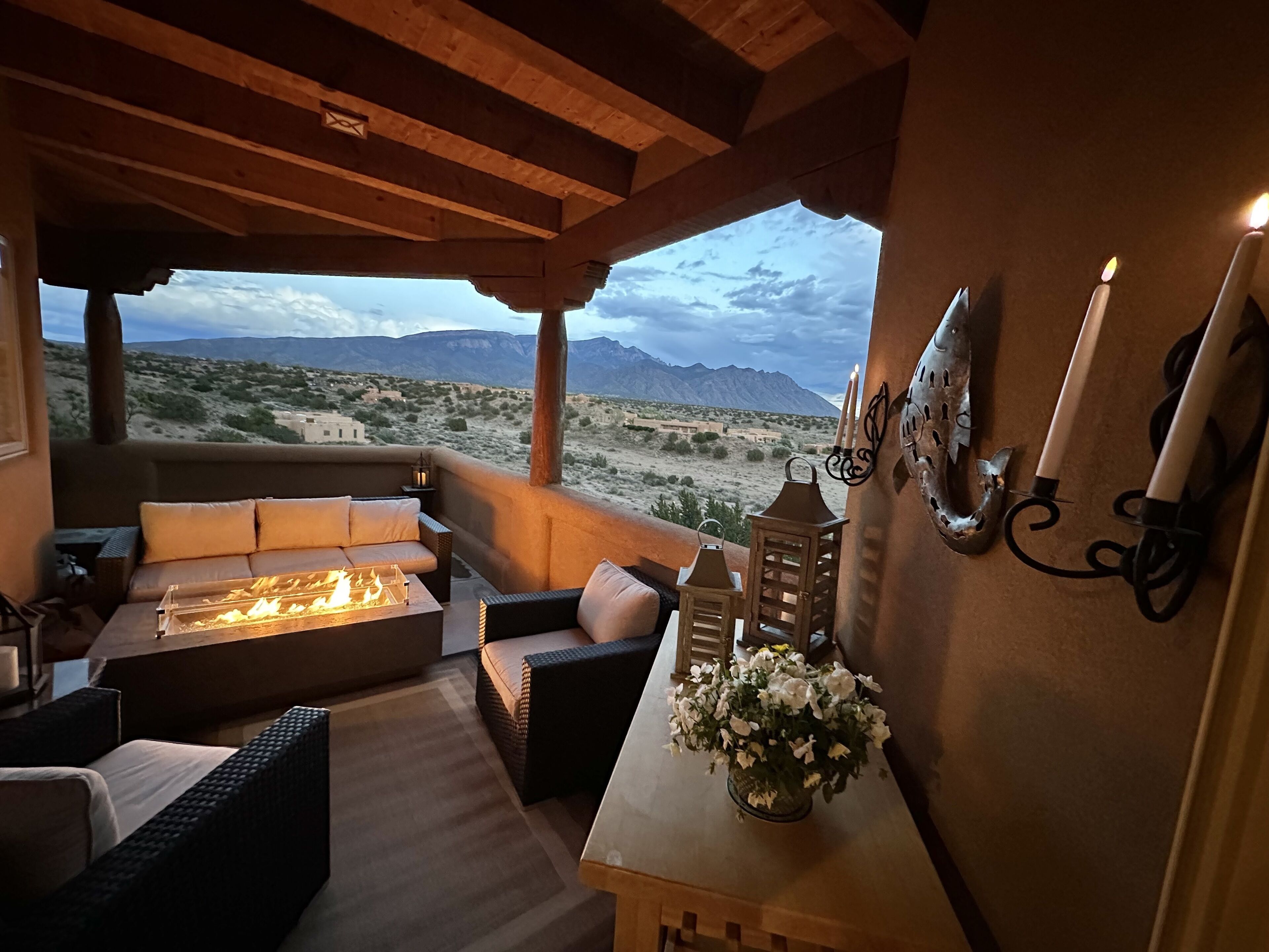 LUXURY ADOBE HACIENDA with AMAZING UNOBSTRUCTED VIEWS of the Sandia Mountains and balloon fiesta one one side and the city lights on the other. Our home is 3400 sqft with 4 bedrooms, 3 bath, 3 patios, game room, full bar, pool table, (w/80” Theater Screen & Dolby Atmos Surround)! Only 10 mins to Albuquerque and 30 minutes from Santa Fe! With its private gated road you will feel safe and secure.